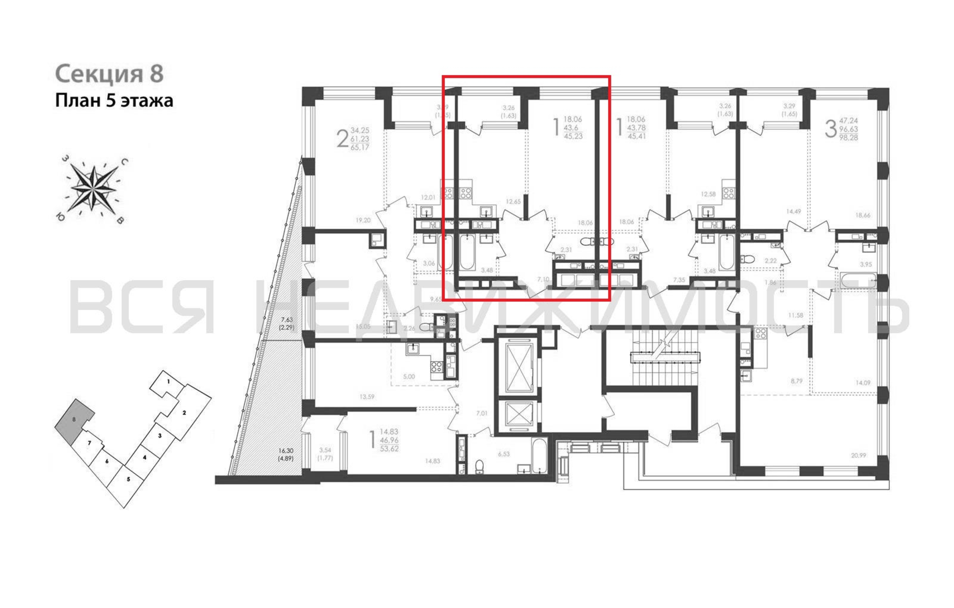 1-комнатная квартира, 45.23 м² 5/17 этаж ID объекта 100102206