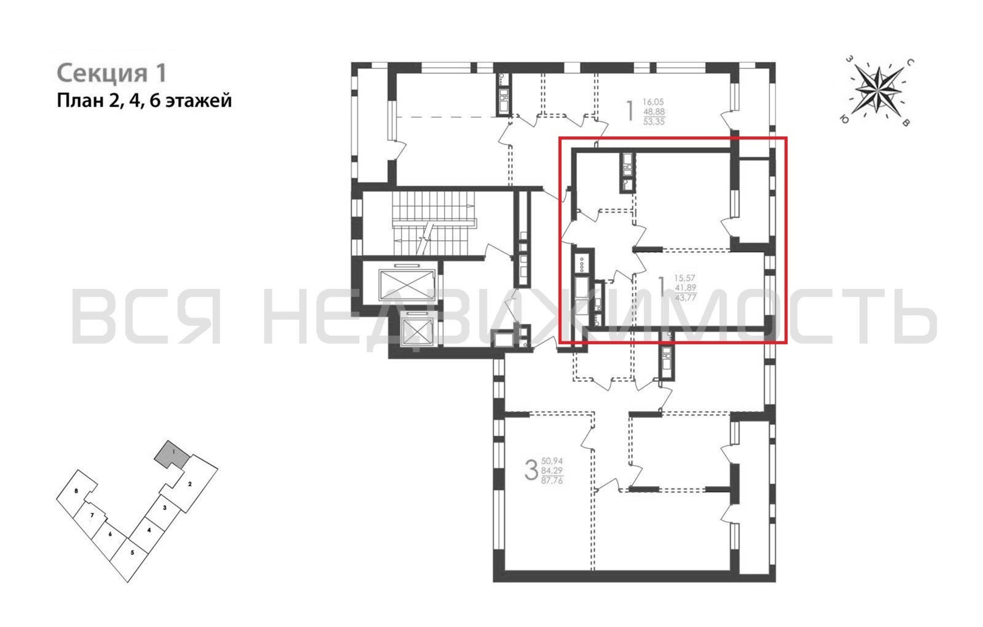 1-комнатная квартира, 43.77 м² 4/12 этаж ID объекта 100102252