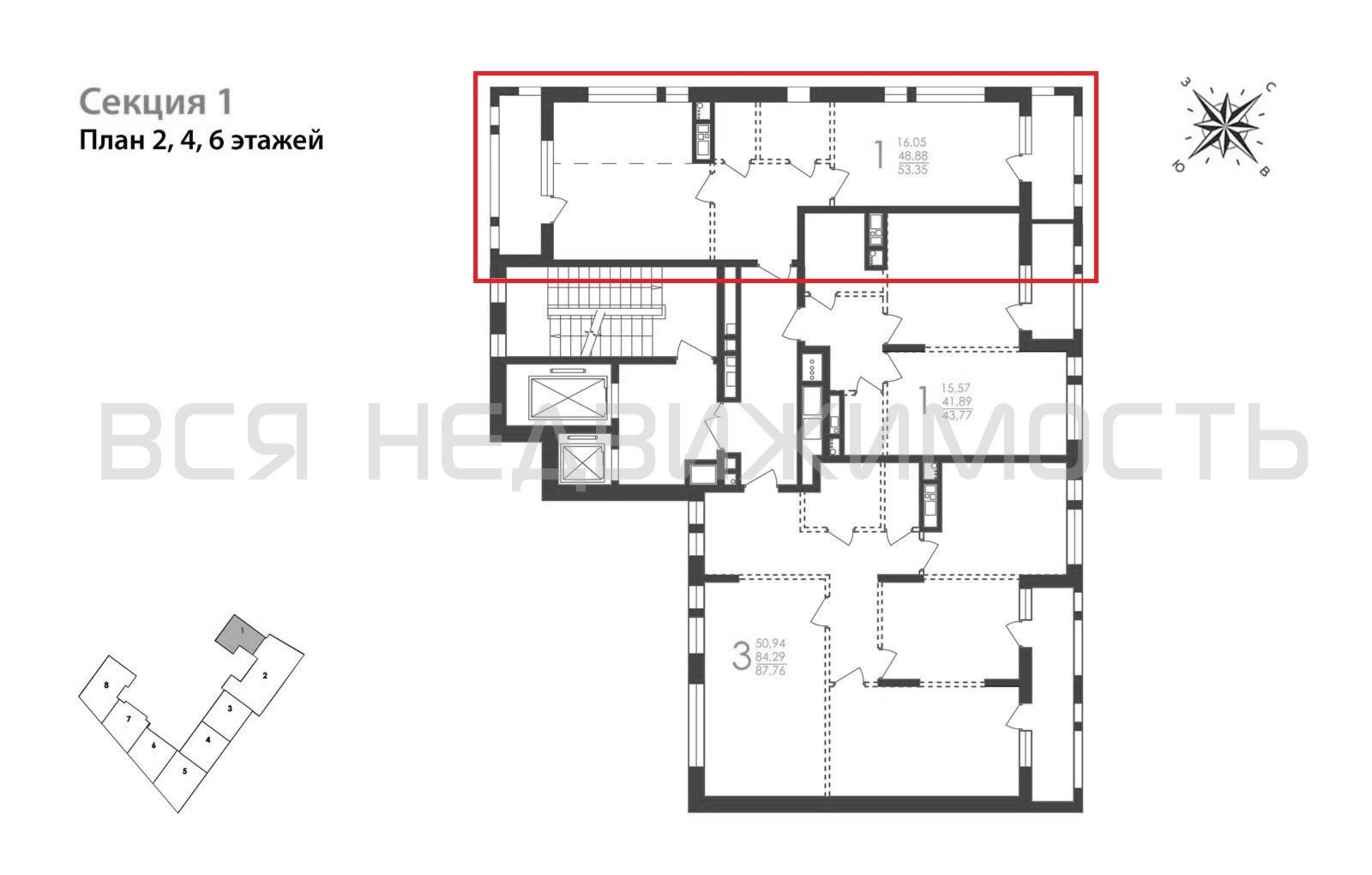 1-комнатная квартира, 53.35 м² 6/12 этаж ID объекта 100102256