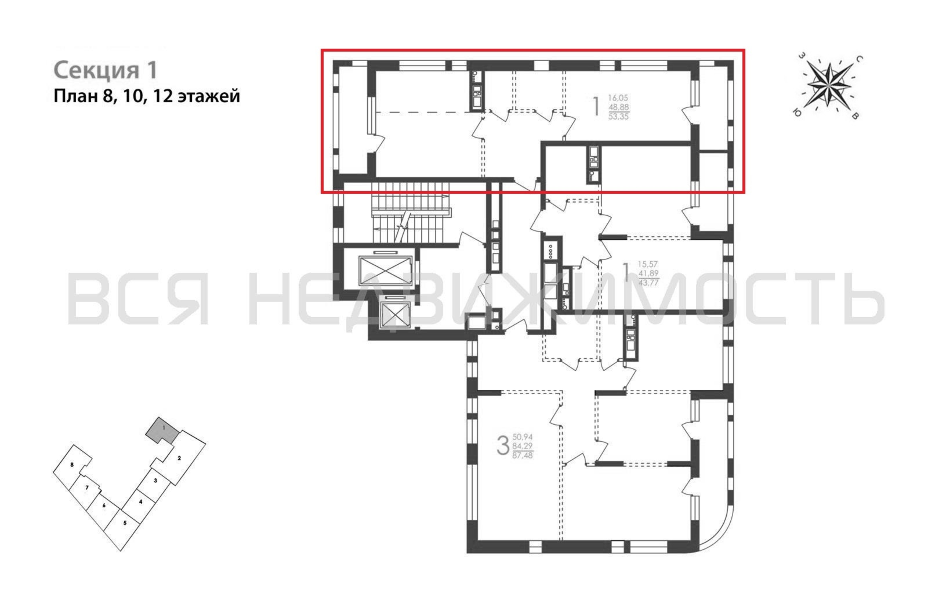 1-комнатная квартира, 53.35 м² 8/12 этаж ID объекта 100102265