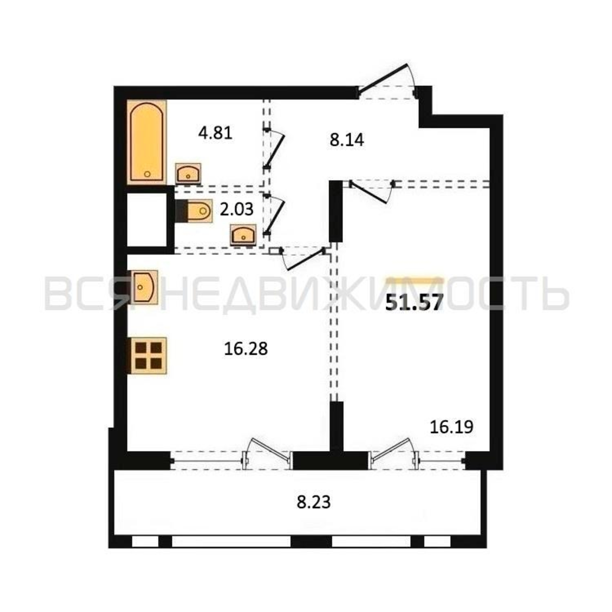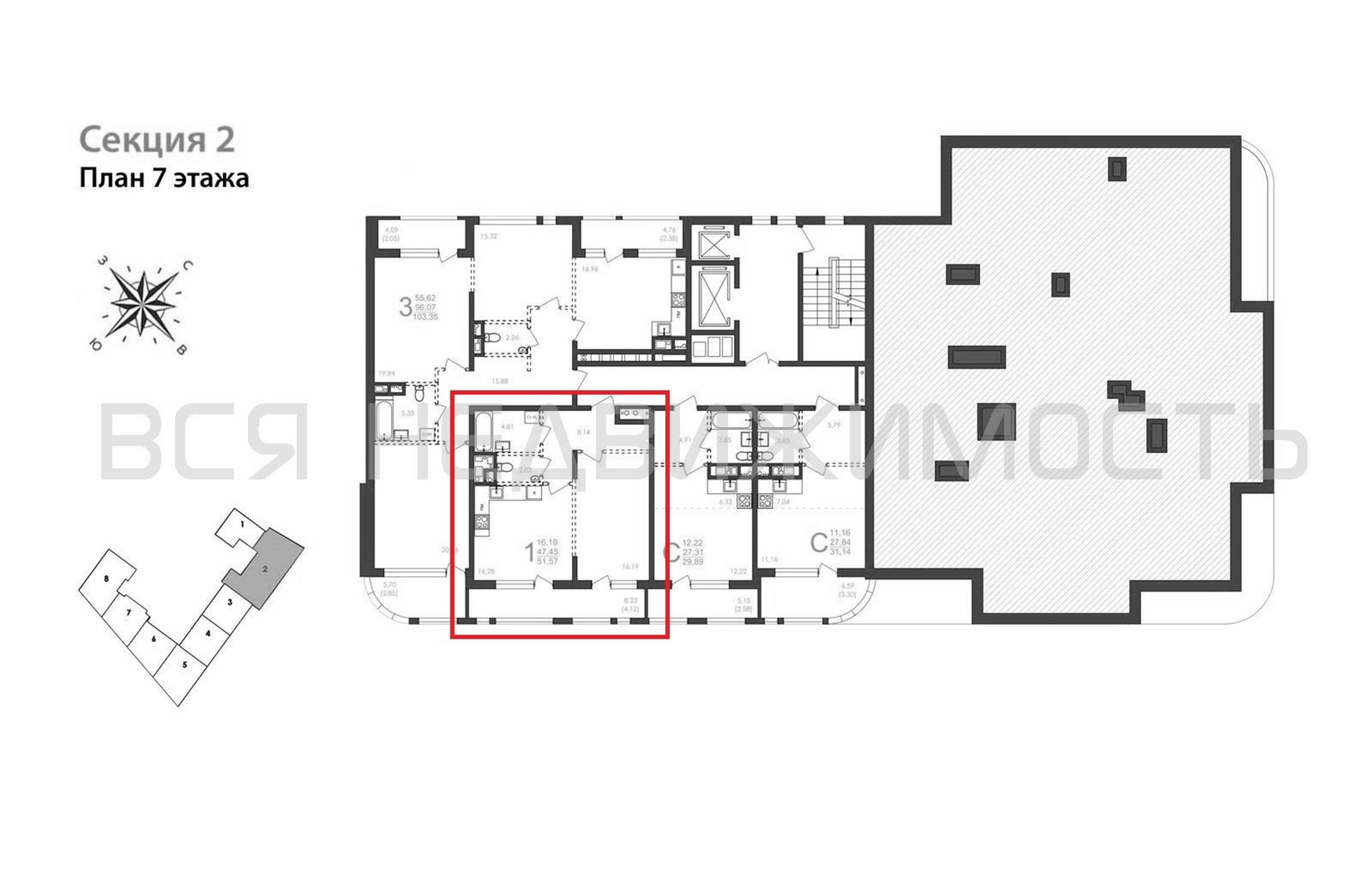 1-комнатная квартира, 51.57 м² 7/7 этаж ID объекта 100102304