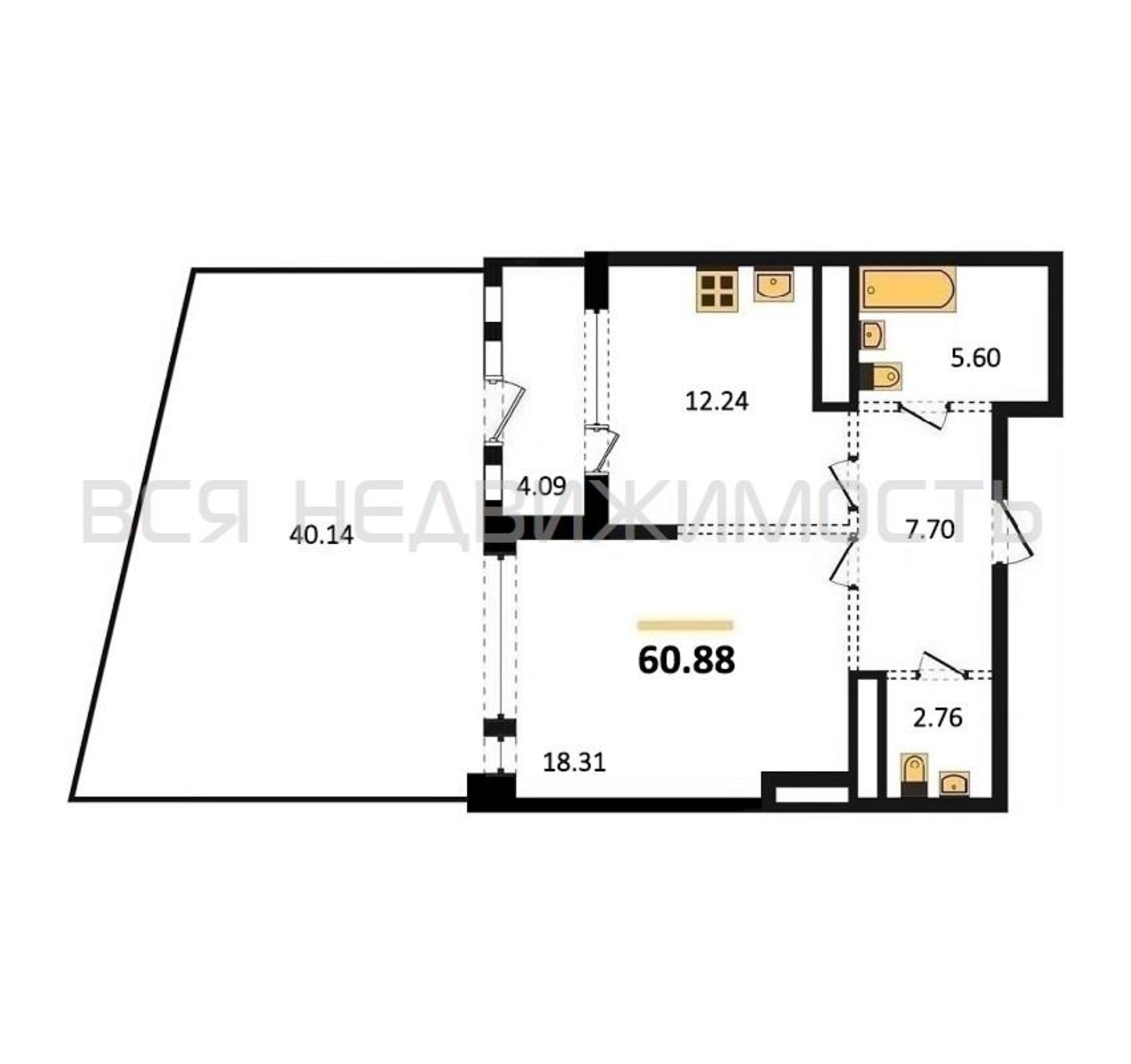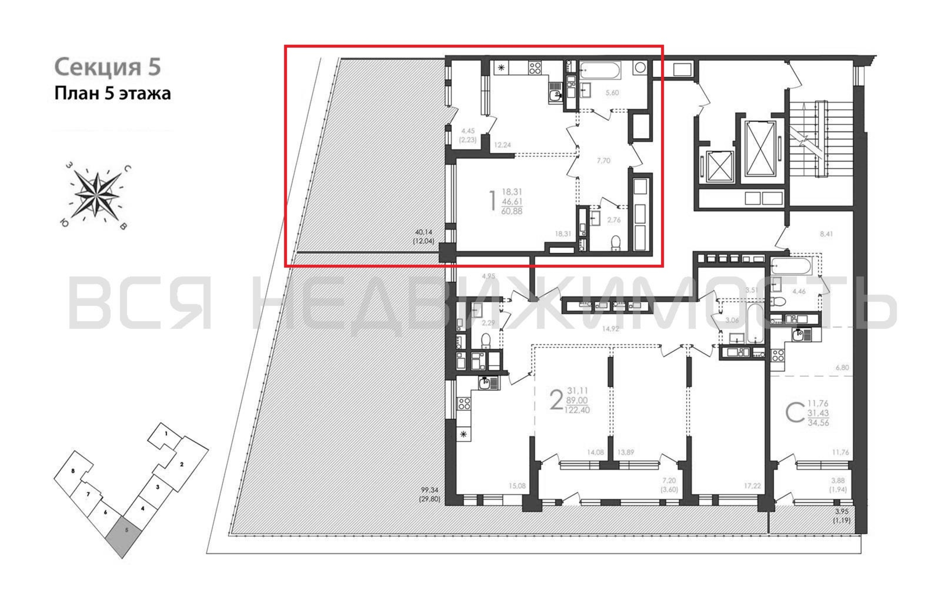 1-комнатная квартира, 60.88 м² 5/8 этаж ID объекта 100102327