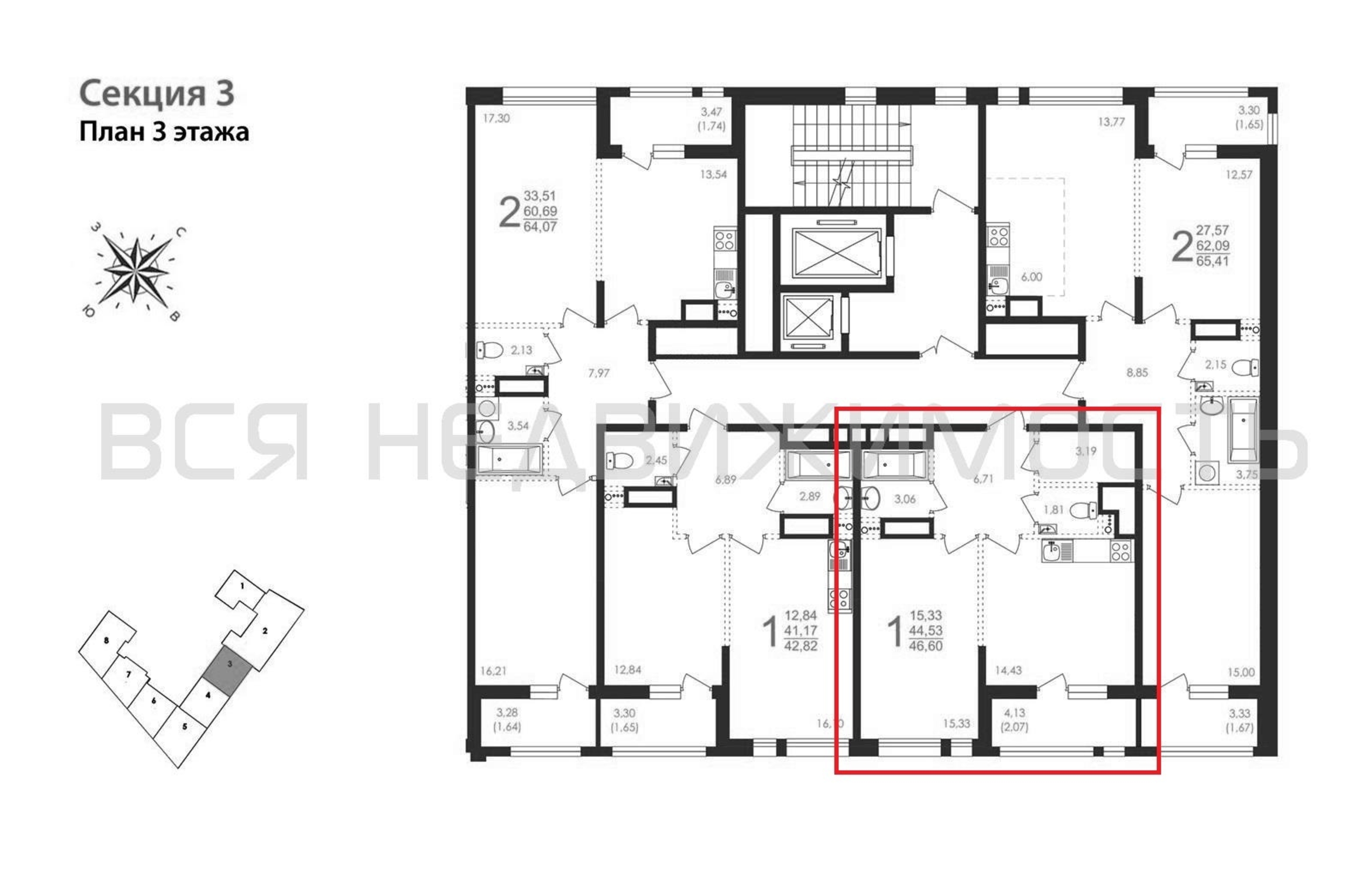 1-комнатная квартира, 46.60 м² 3/8 этаж ID объекта 100102454