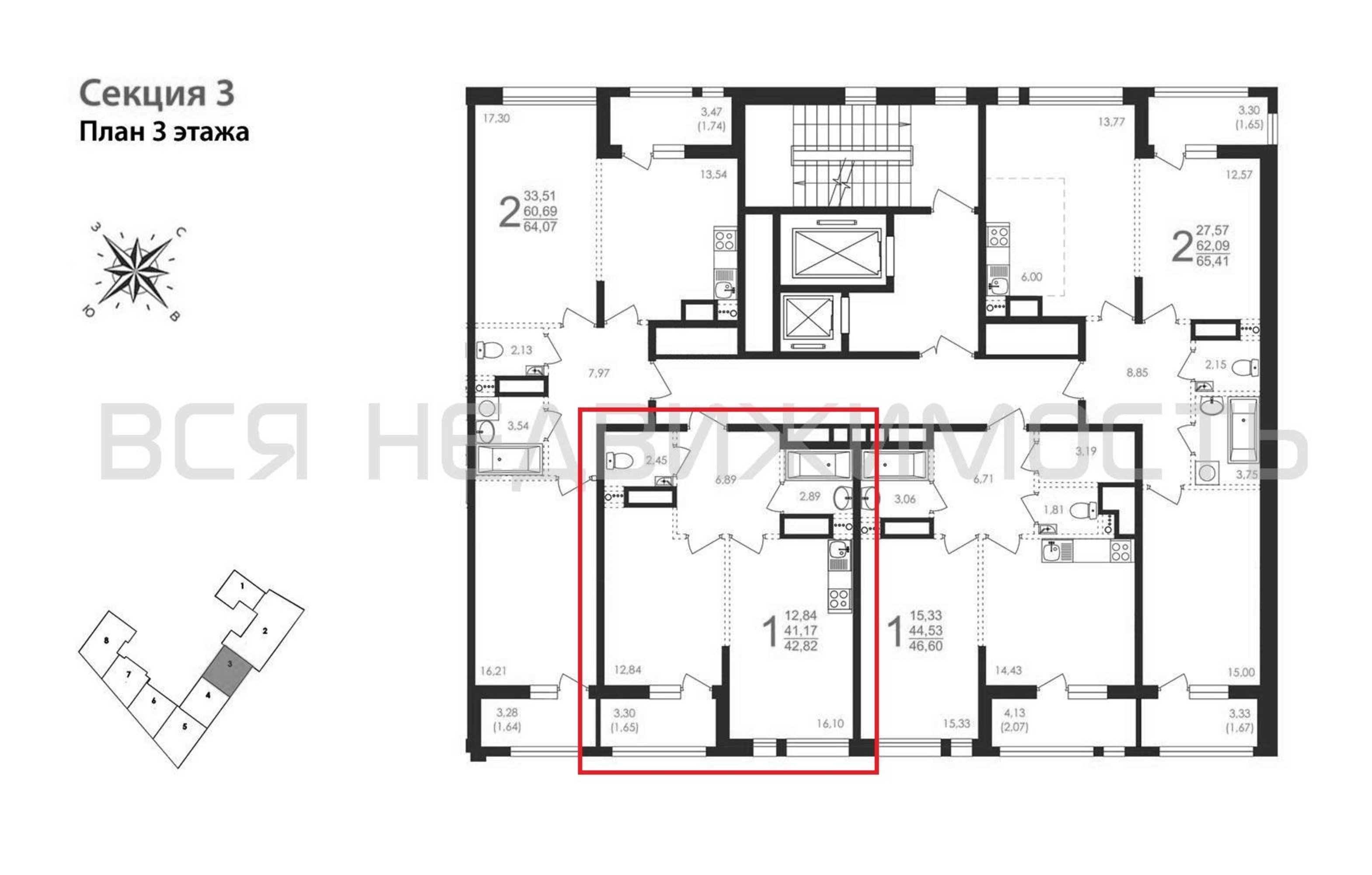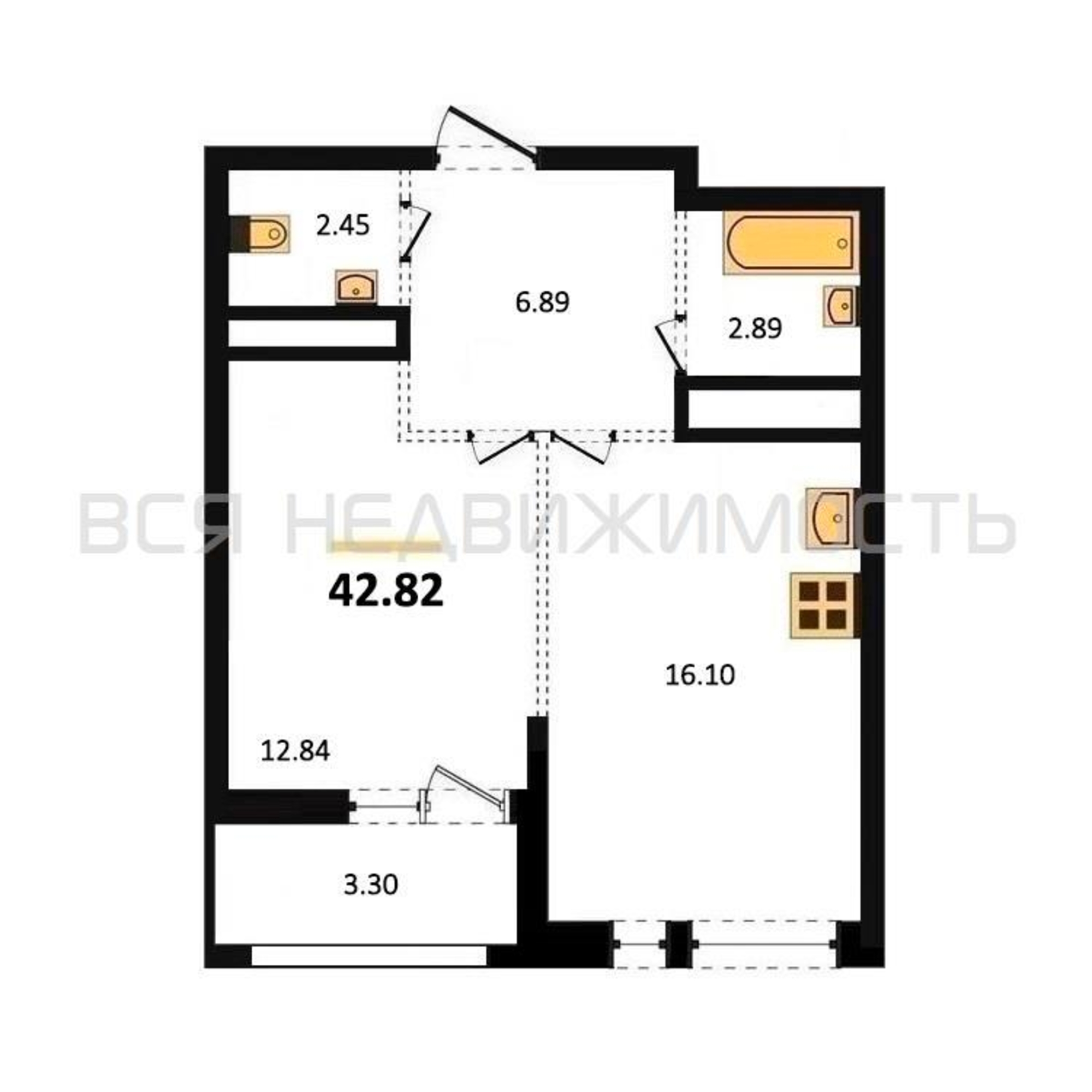1-комнатная квартира, 42.82 м² 3/8 этаж ID объекта 100102455