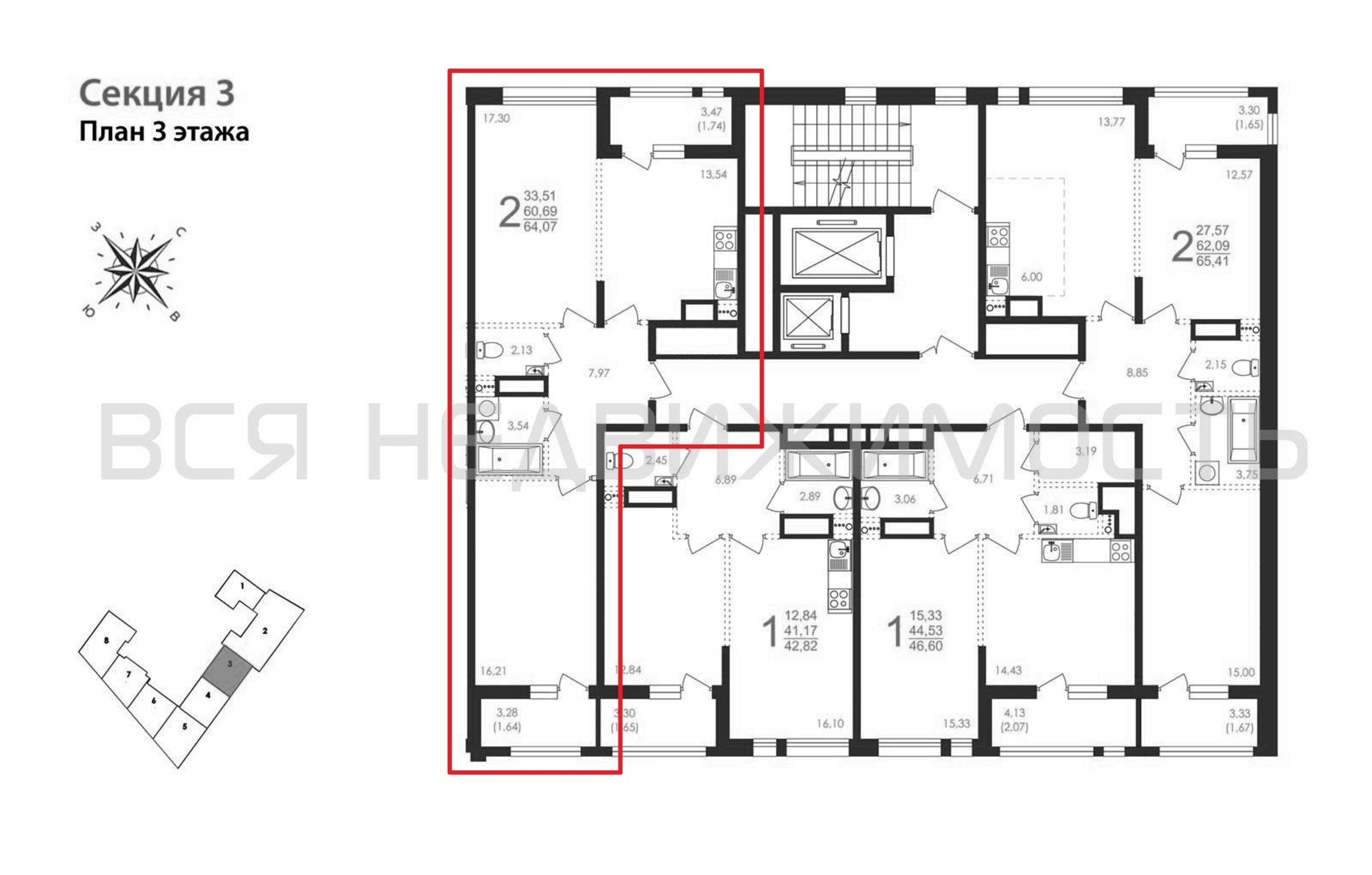 2-комнатная квартира, 64.07 м² 3/8 этаж ID объекта 100102456