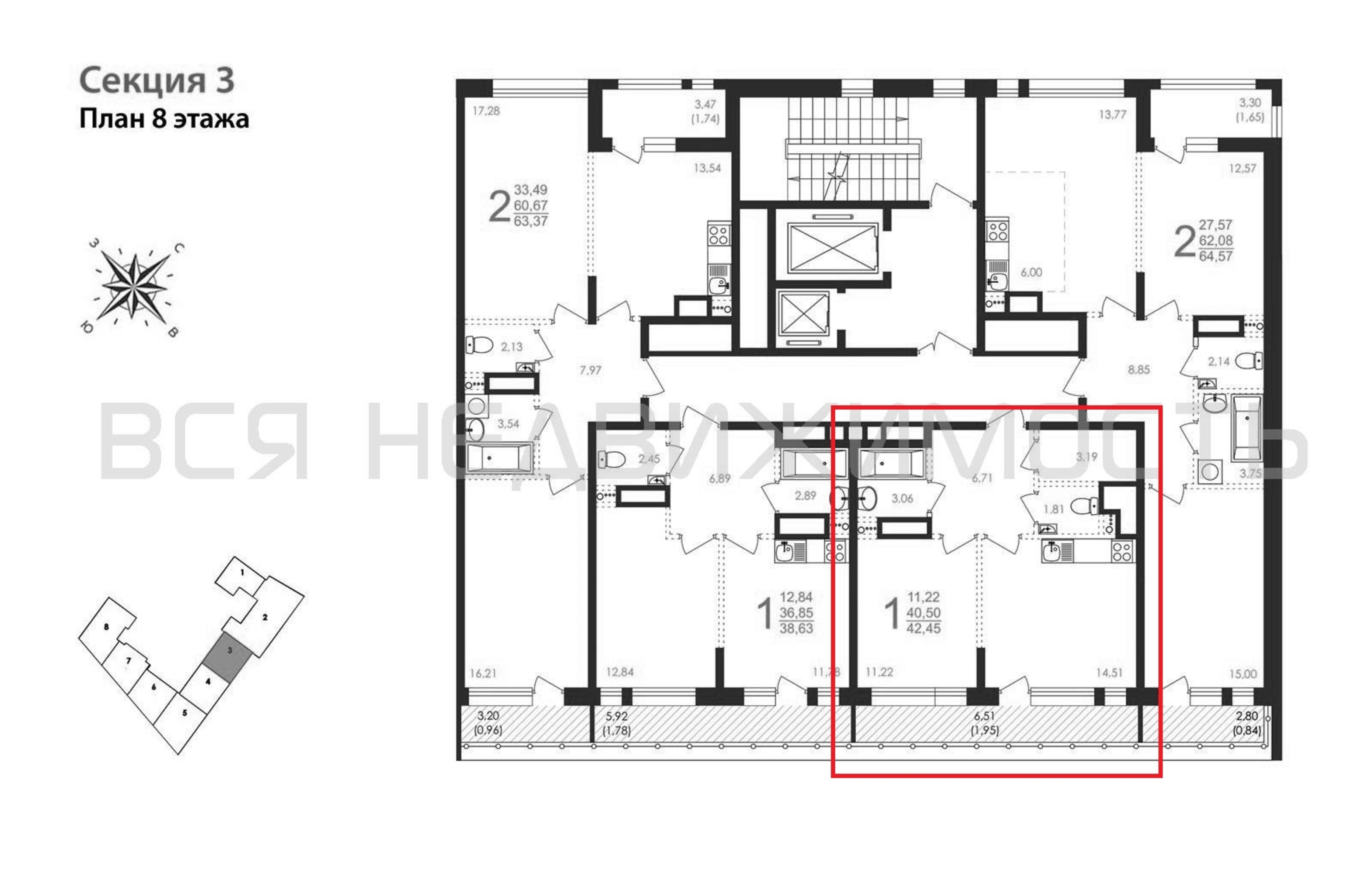 1-комнатная квартира, 42.45 м² 8/8 этаж ID объекта 100102474