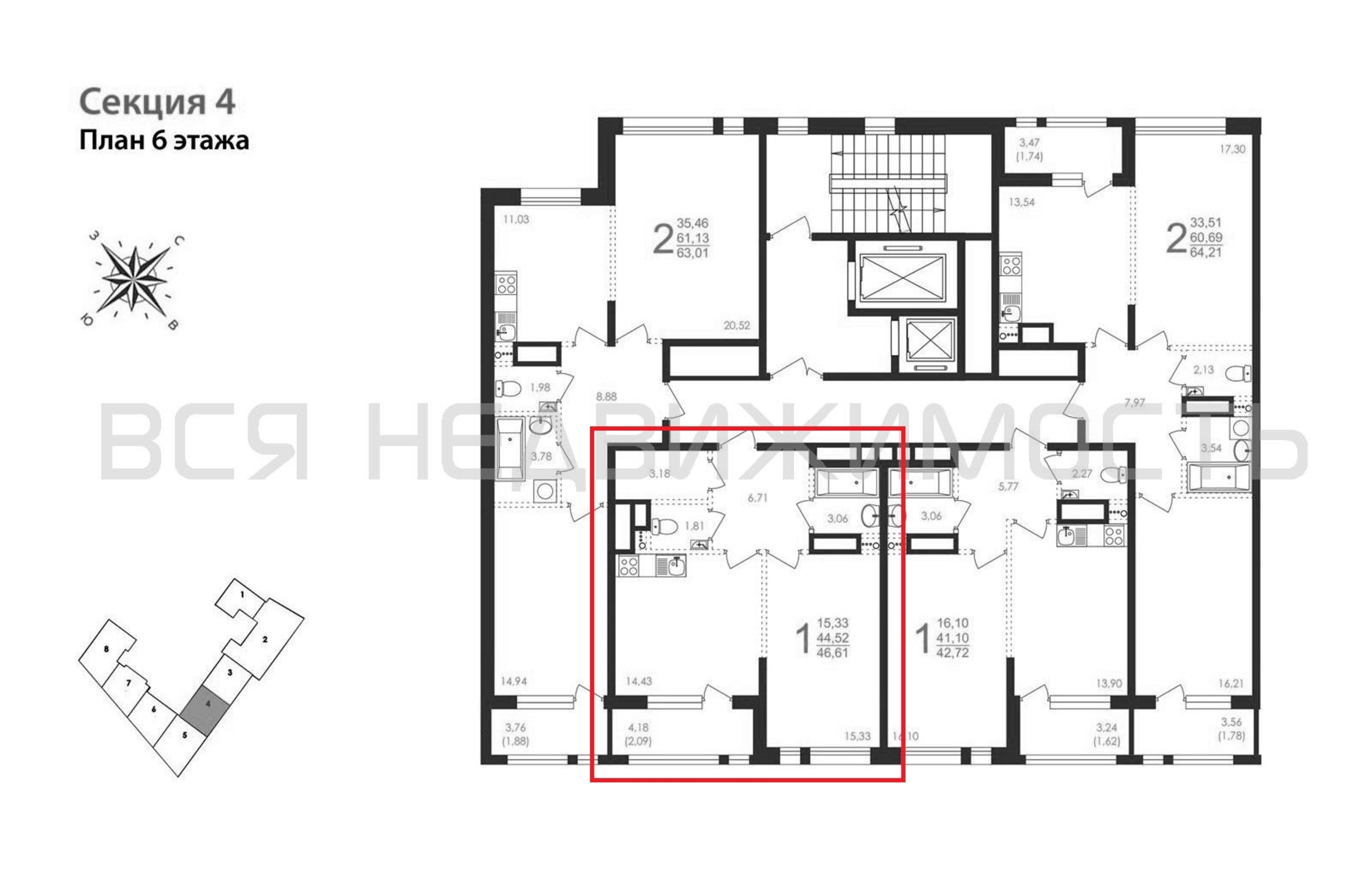1-комнатная квартира, 46.61 м² 6/8 этаж ID объекта 100102495