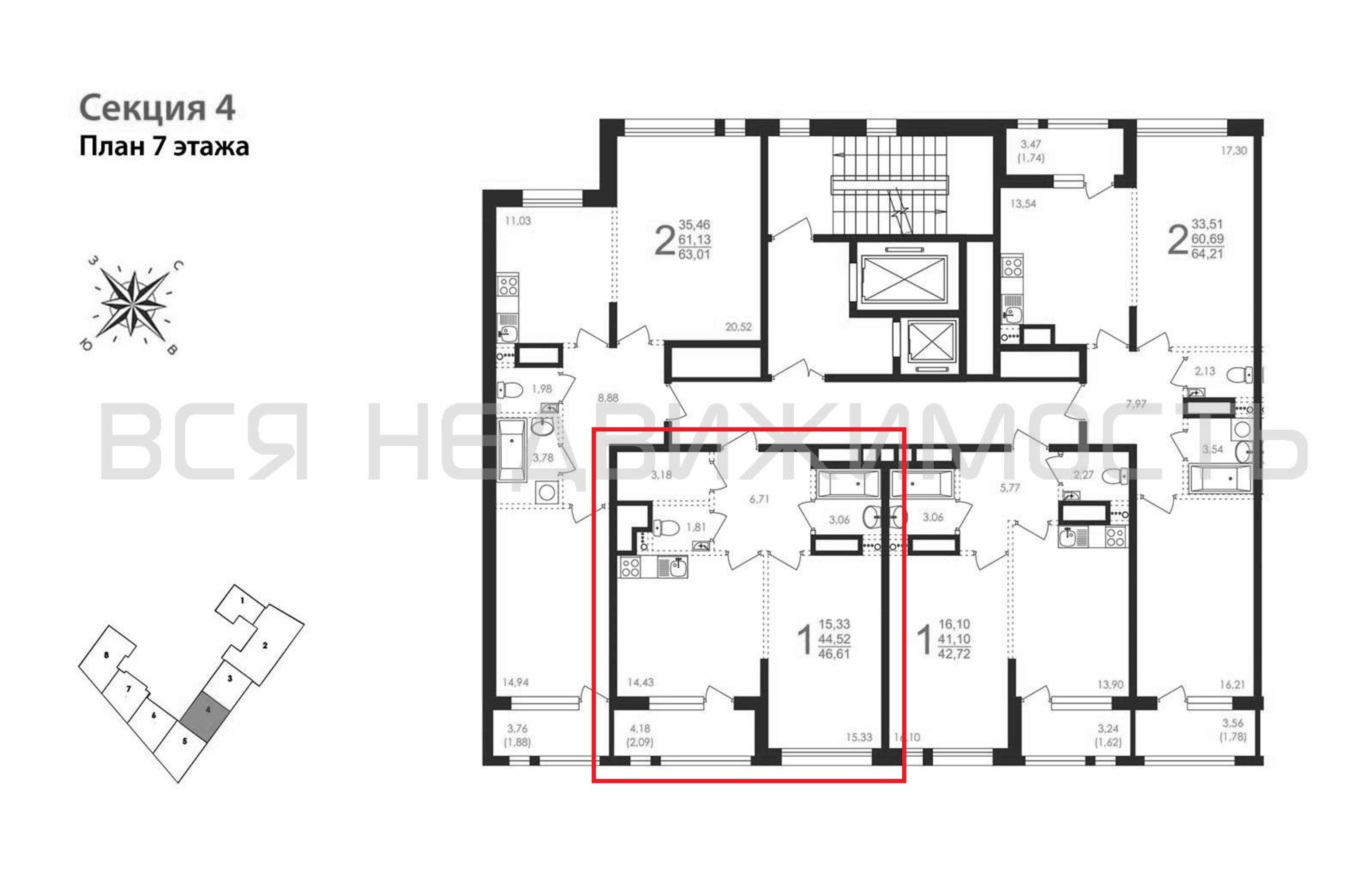 1-комнатная квартира, 46.61 м² 7/8 этаж ID объекта 100102499