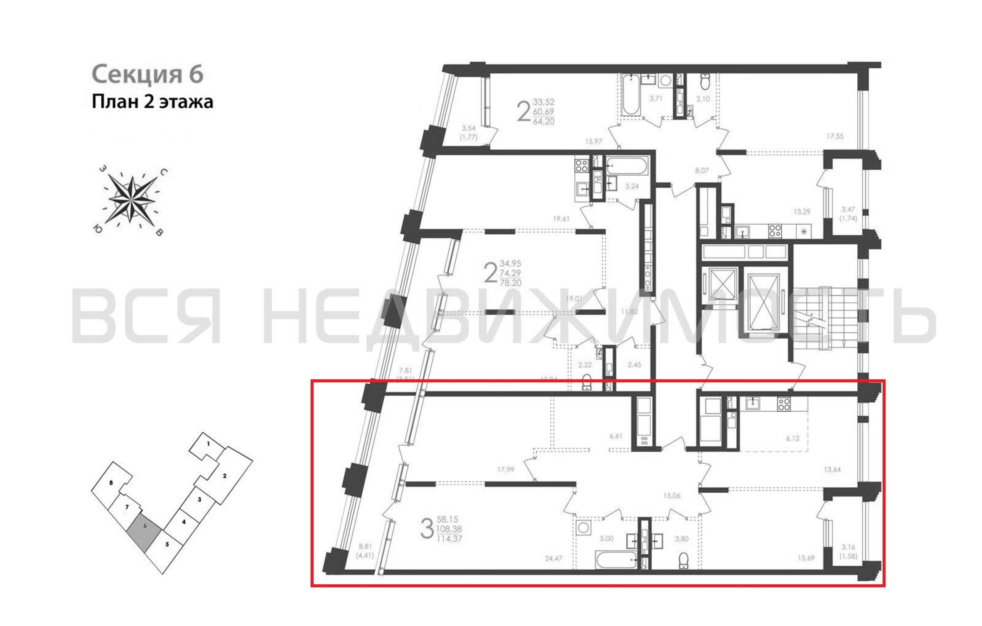 3-комнатная квартира, 114.37 м² 2/8 этаж ID объекта 100102508