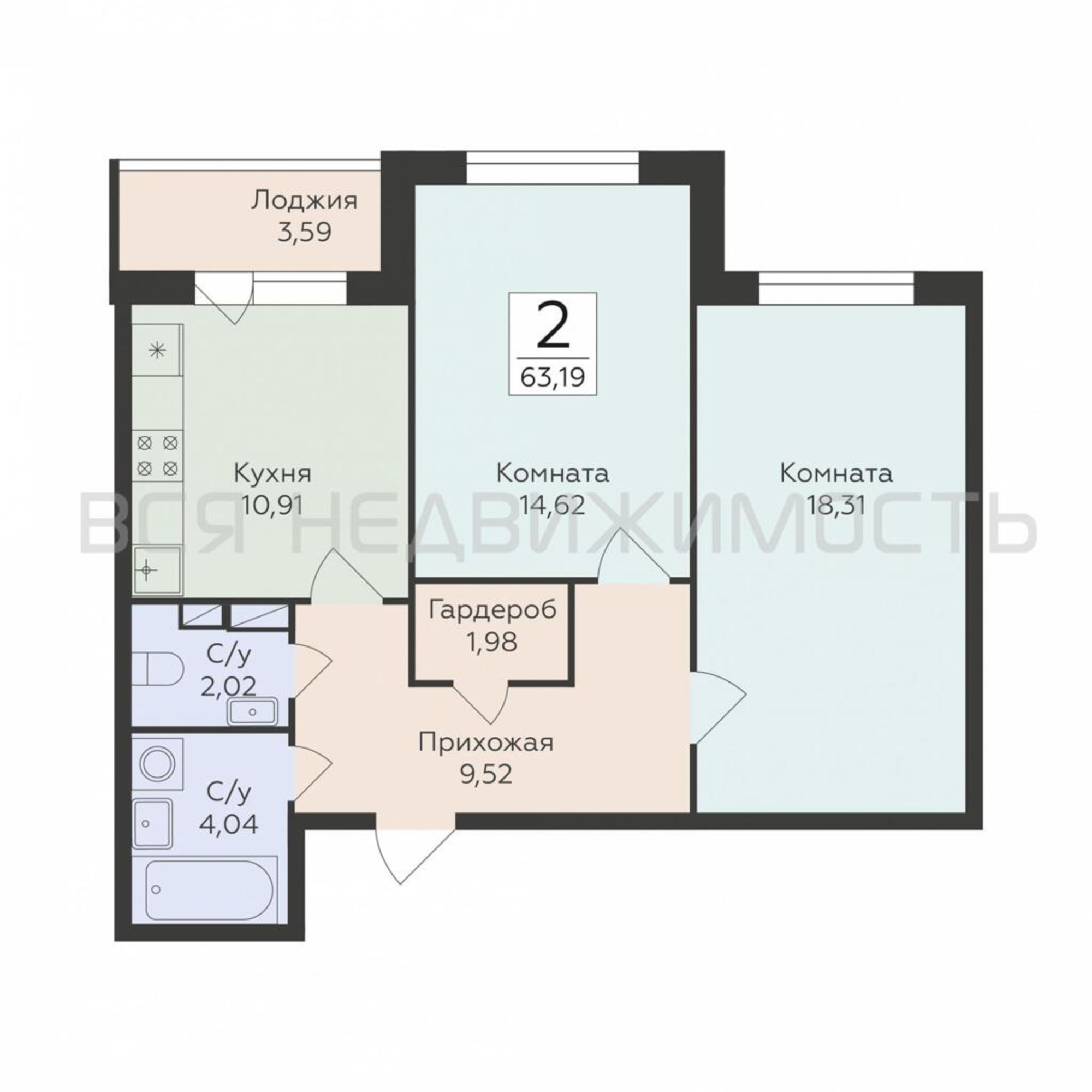 2-комнатная квартира, 63.19 м² 13/16 этаж ID объекта 100103499