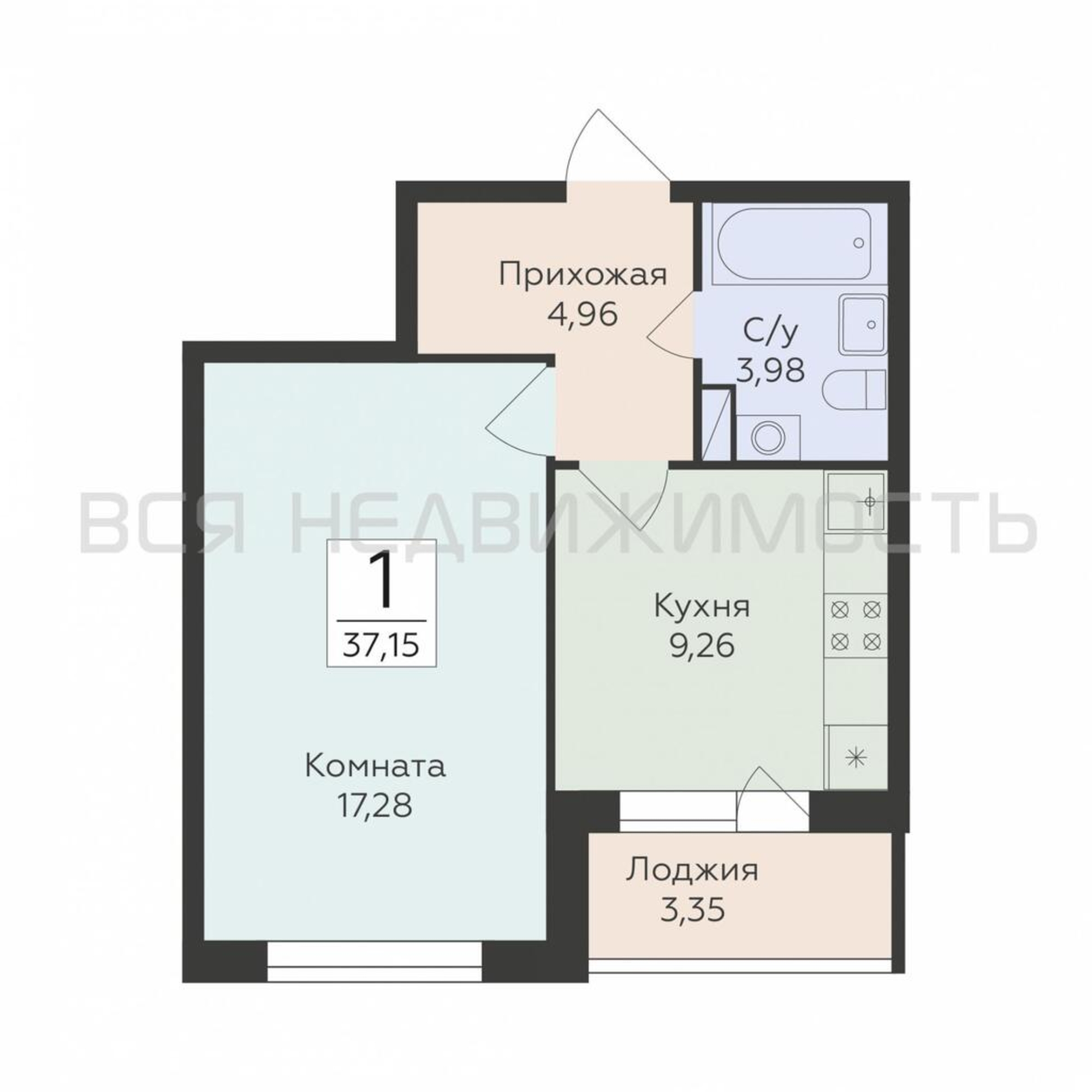 1-комнатная квартира, 37.15 м² 10/18 этаж ID объекта 100103595