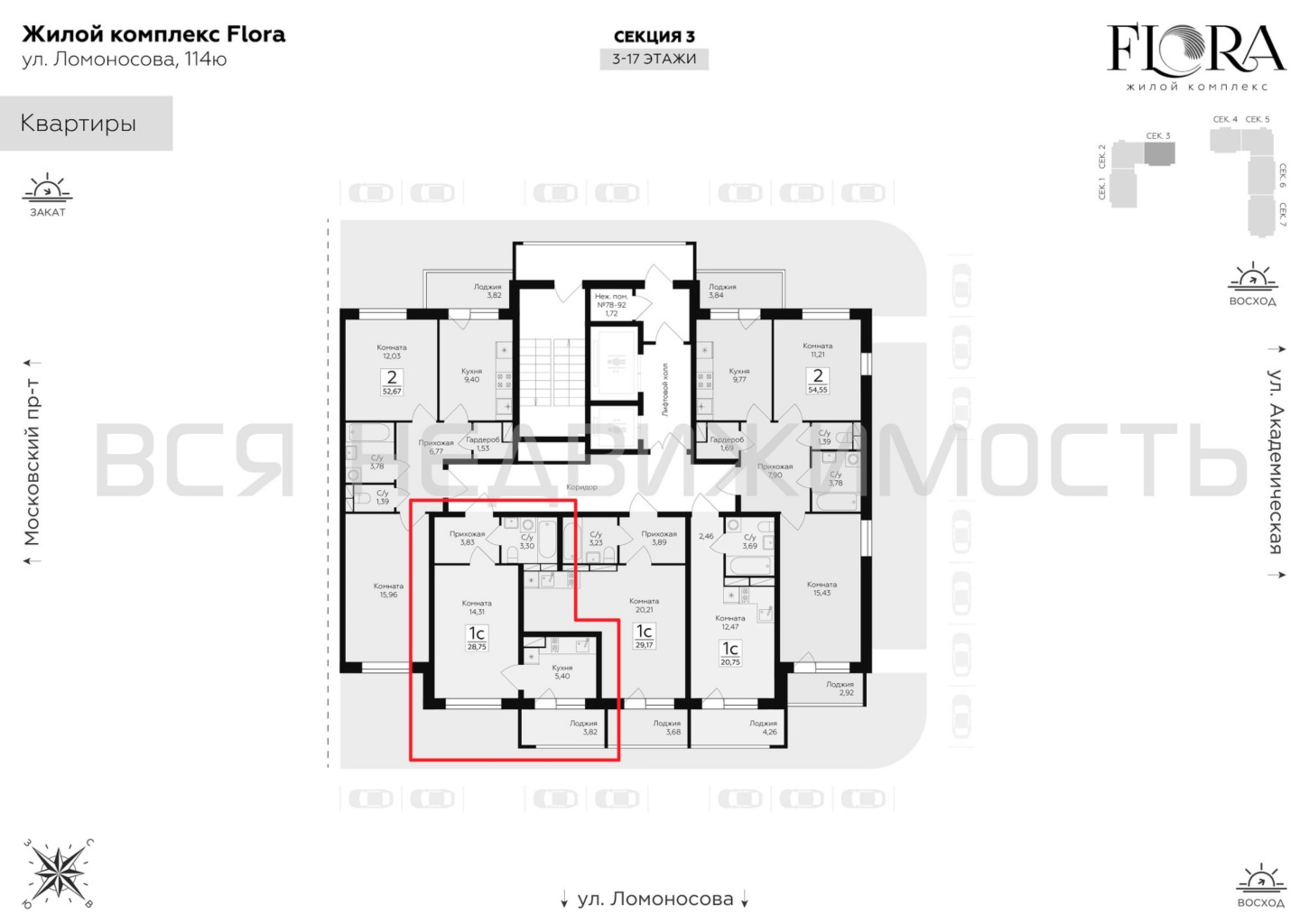 1-комнатная квартира, 28.75 м² 14/17 этаж ID объекта 100103978