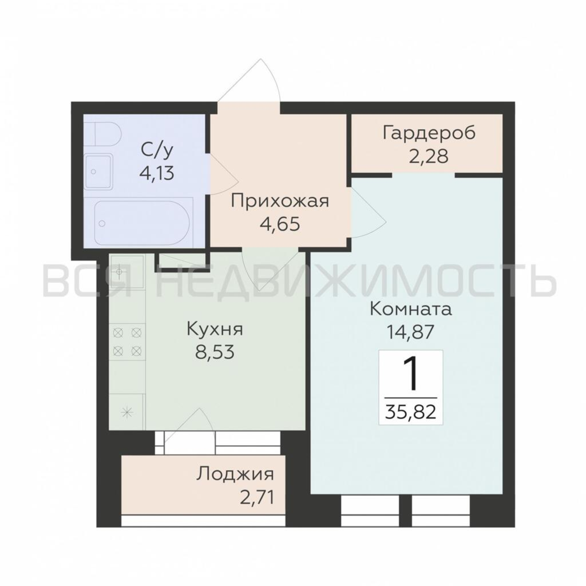 1-комнатная квартира, 35.82 м² 5/8 этаж ID объекта 100104068