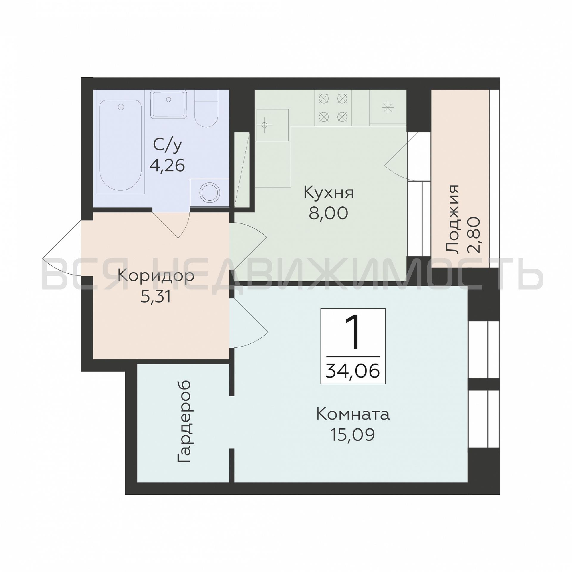 1-комнатная квартира, 34.06 м² 5/12 этаж ID объекта 100104466