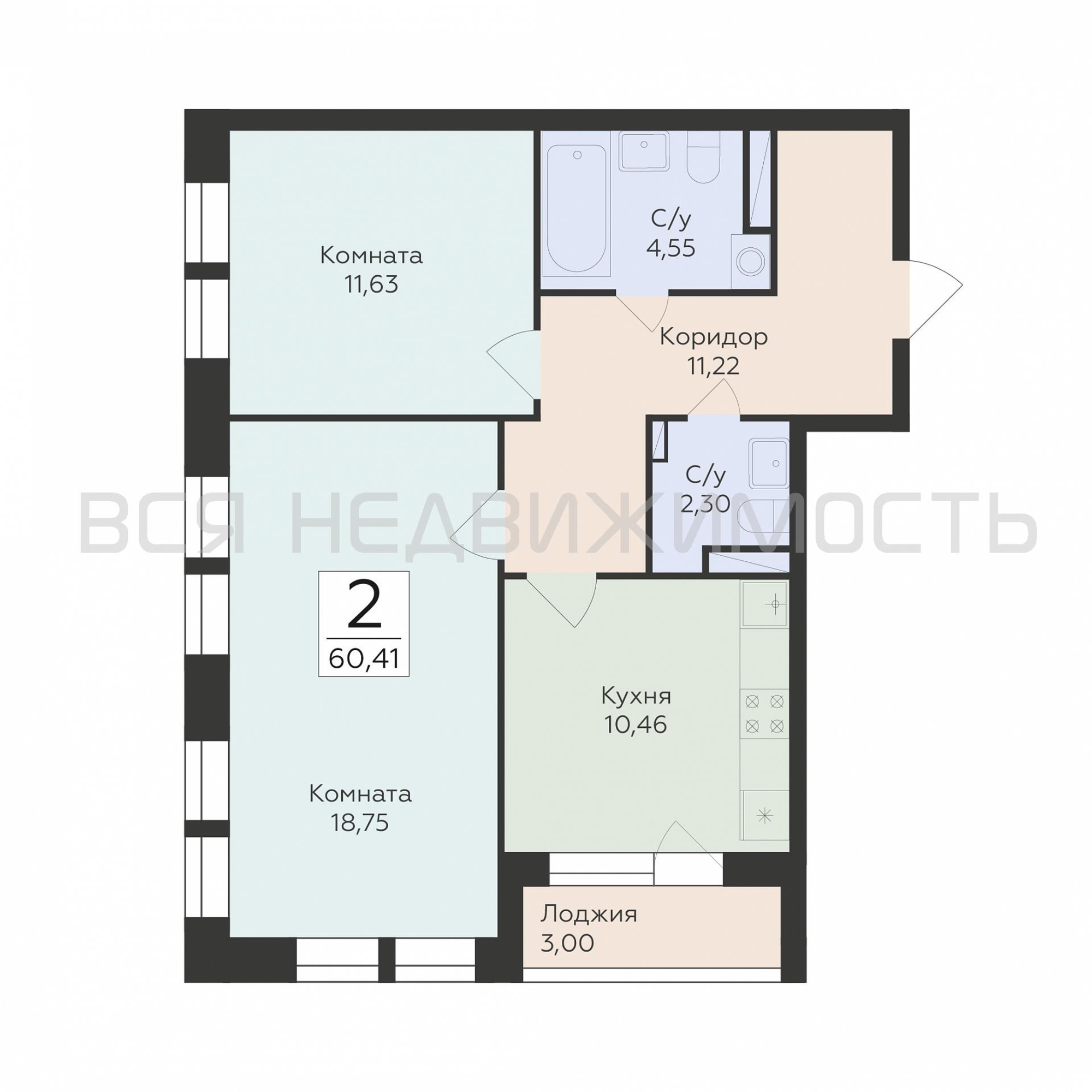 2-комнатная квартира, 60.41 м² 6/12 этаж ID объекта 100104474