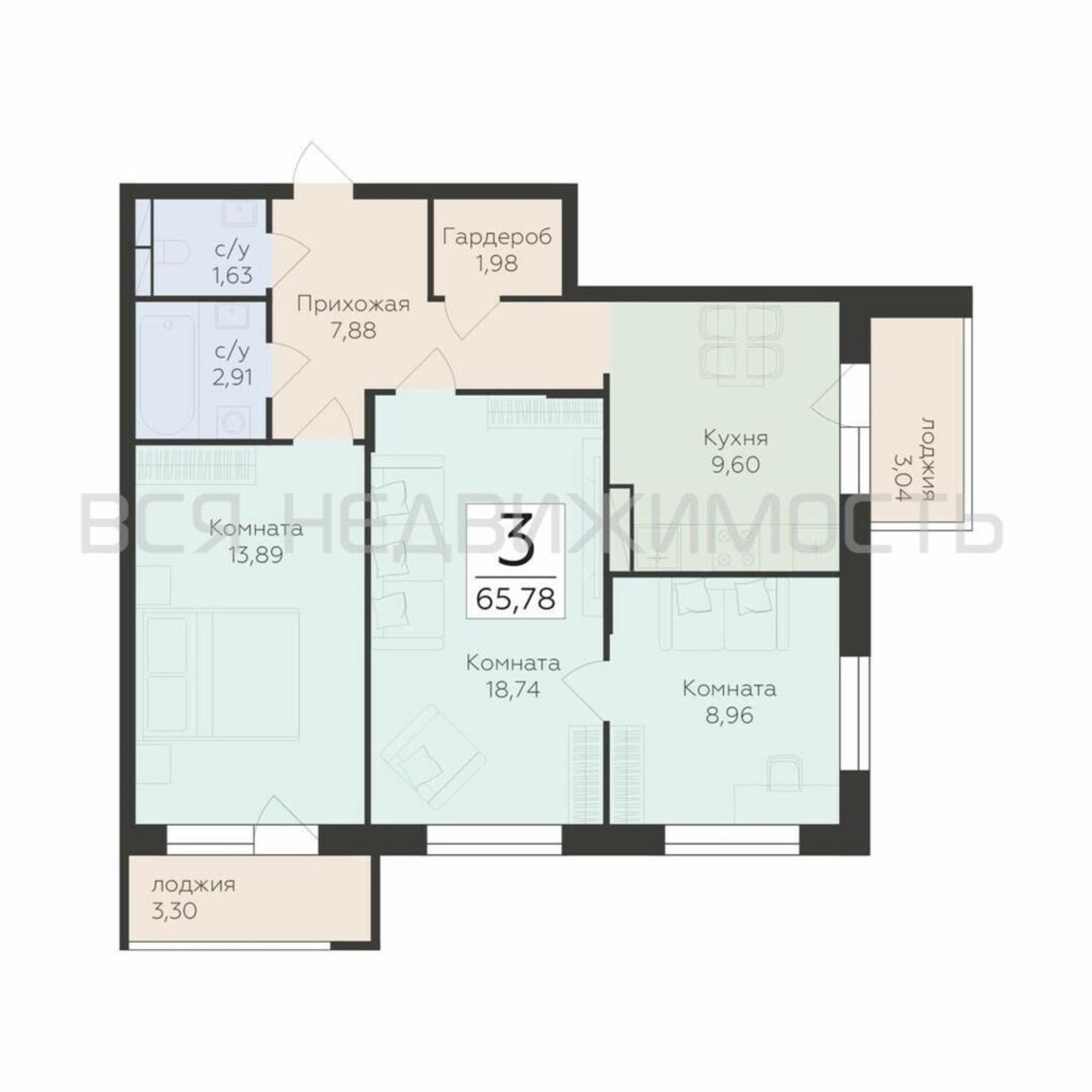 3-комнатная квартира, 65.78 м² 5/19 этаж ID объекта 100104732