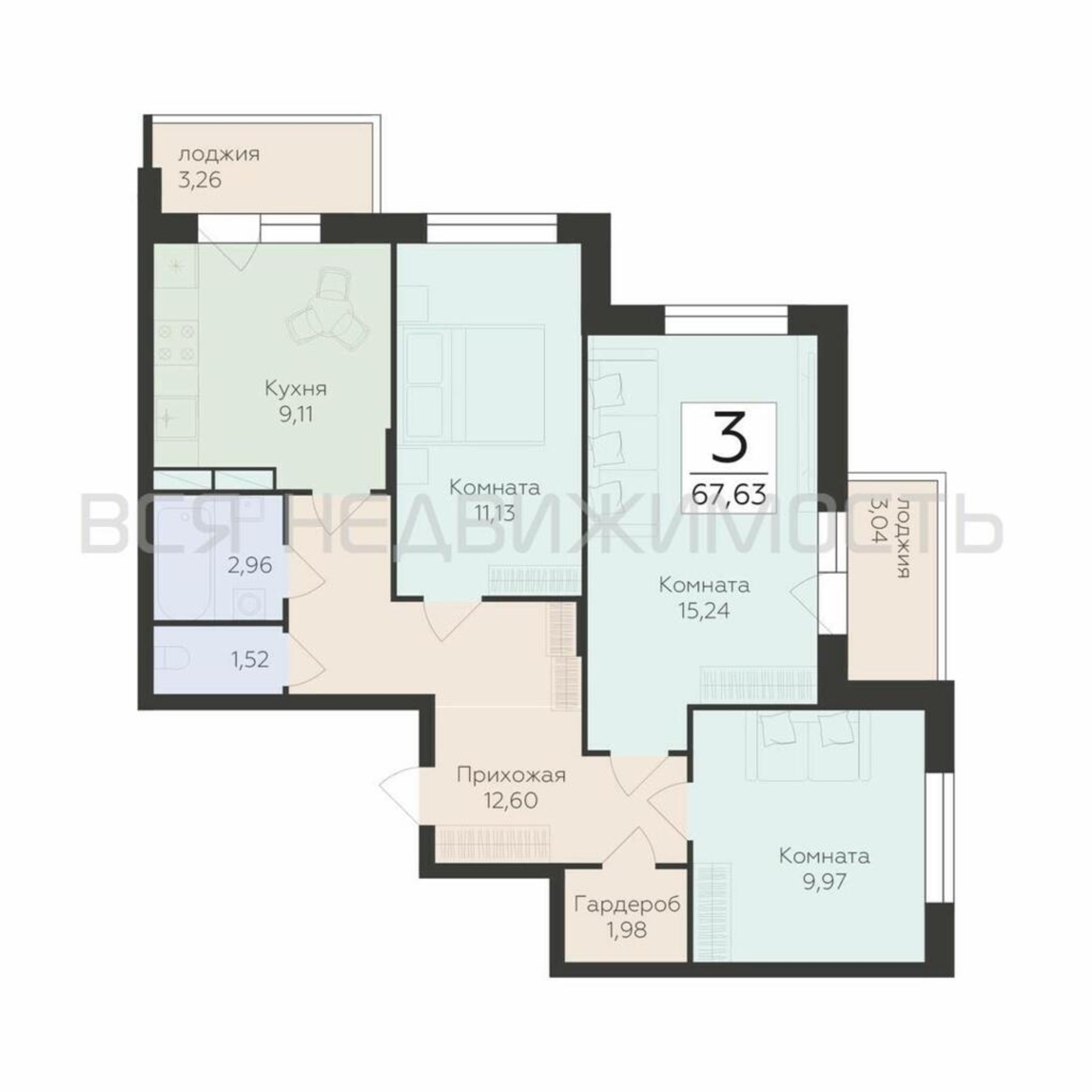 3-комнатная квартира, 67.63 м² 13/19 этаж ID объекта 100104787