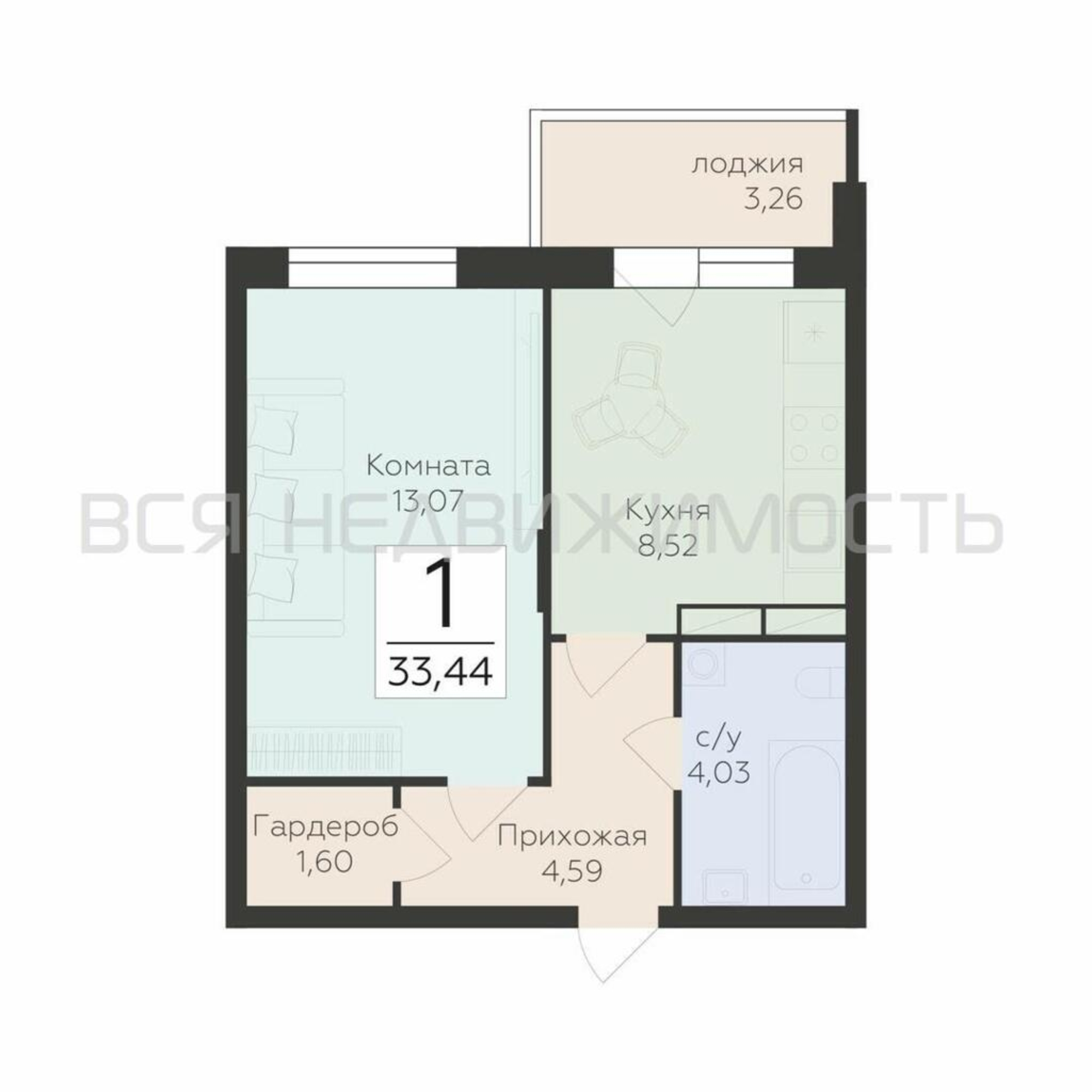 1-комнатная квартира, 33.44 м² 19/19 этаж ID объекта 100104835