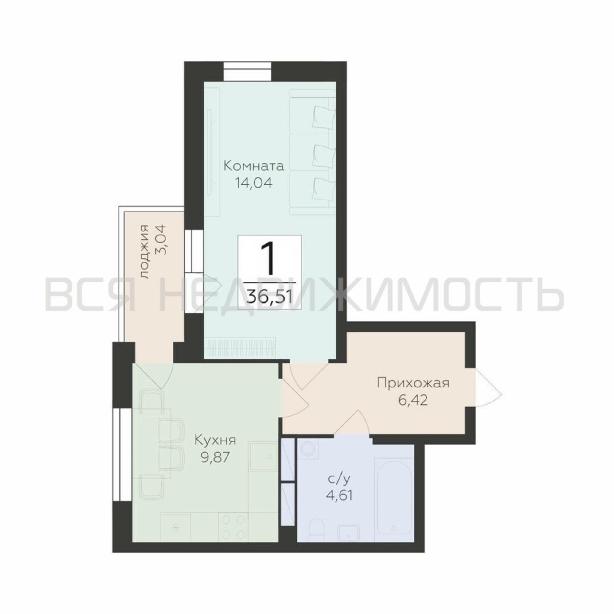 1-комнатная квартира, 36.51 м² 13/15 этаж ID объекта 100104950