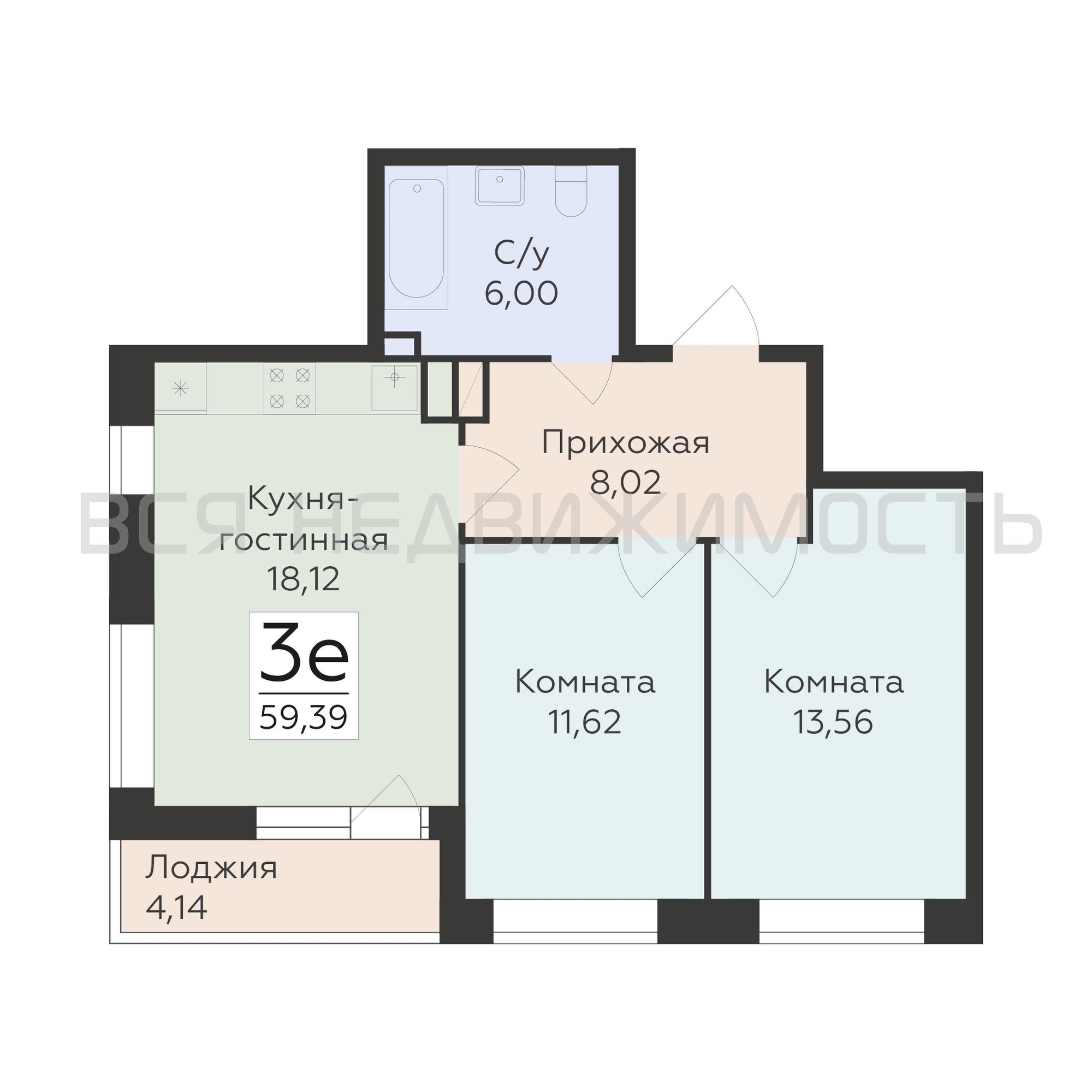 2-комнатная квартира, 59.39 м² 15/24 этаж ID объекта 100106194