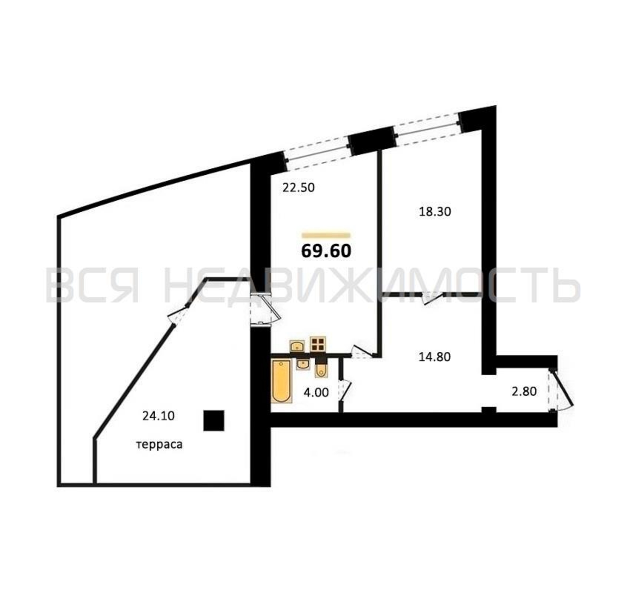 1-комнатная квартира, 69.60 м² 8/9 этаж ID объекта 100106778