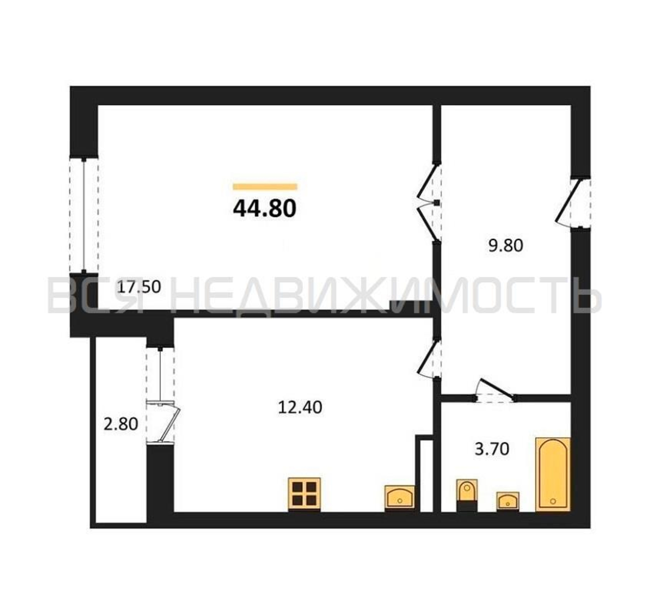 1-комнатная квартира, 44.80 м² 4/7 этаж ID объекта 100106988