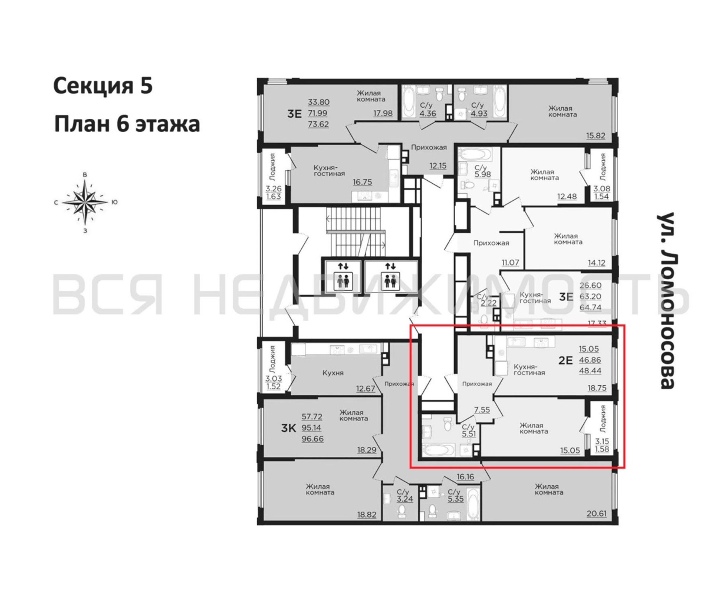 1-комнатная квартира, 48.44 м² 6/15 этаж ID объекта 100109146