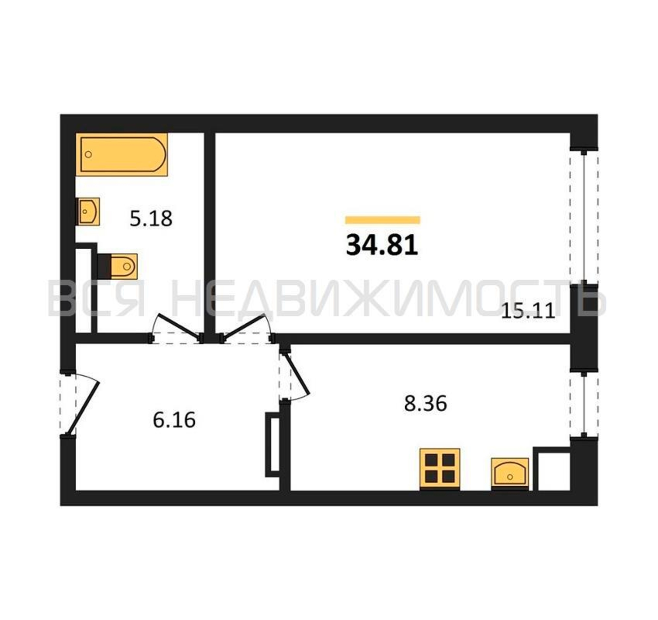 1-комнатная квартира, 34.81 м² 1/4 этаж ID объекта 100111629
