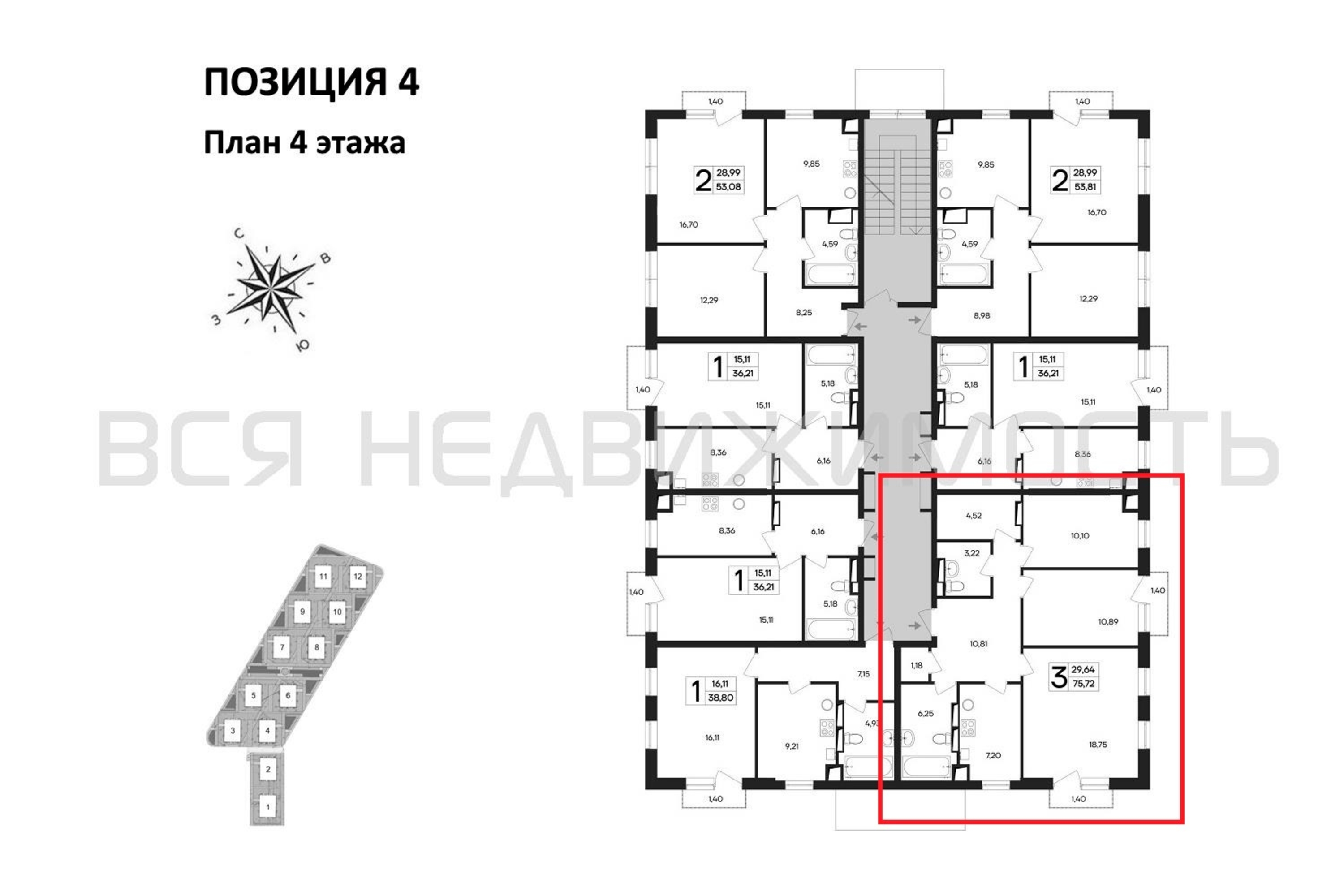 3-комнатная квартира, 75.72 м² 4/4 этаж ID объекта 100111684