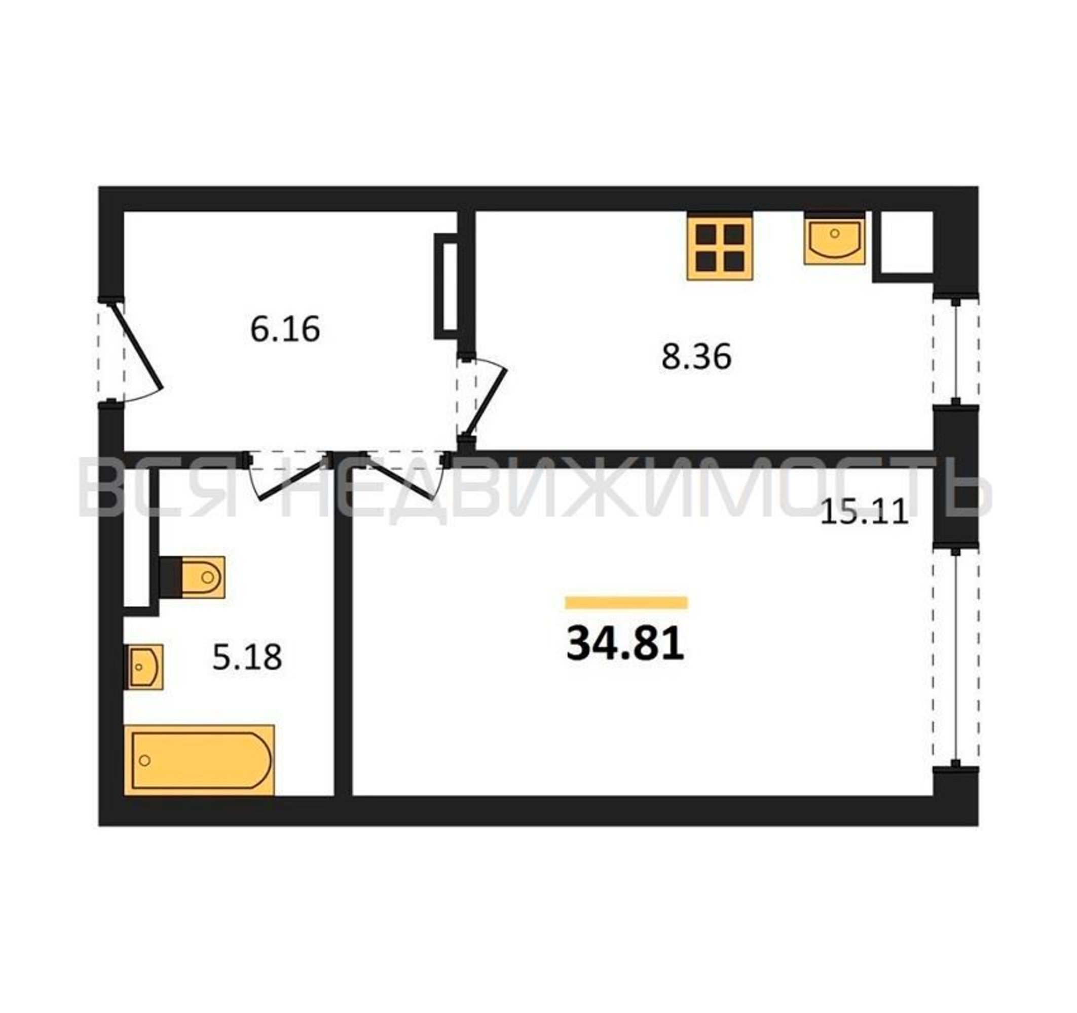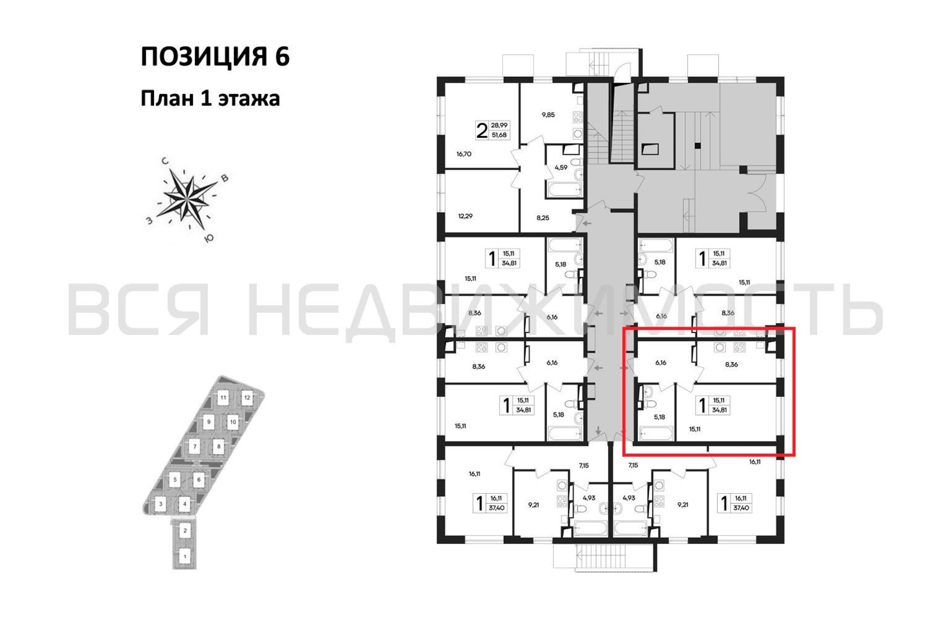 1-комнатная квартира, 34.81 м² 1/4 этаж ID объекта 100111721