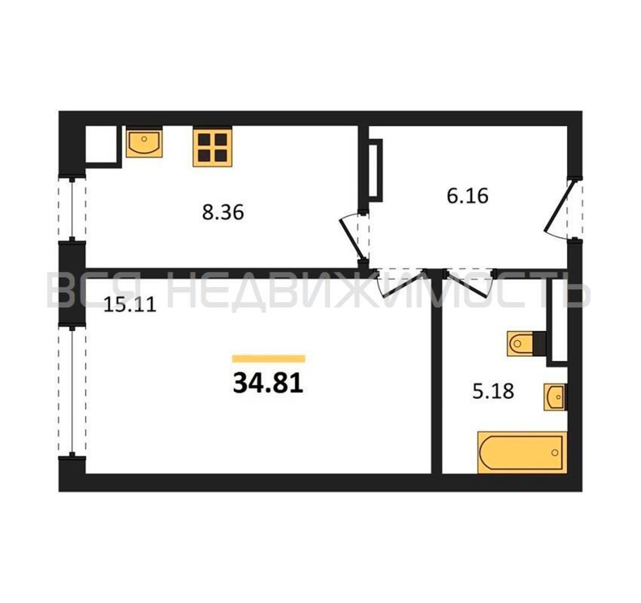1-комнатная квартира, 34.81 м² 1/4 этаж ID объекта 100111817
