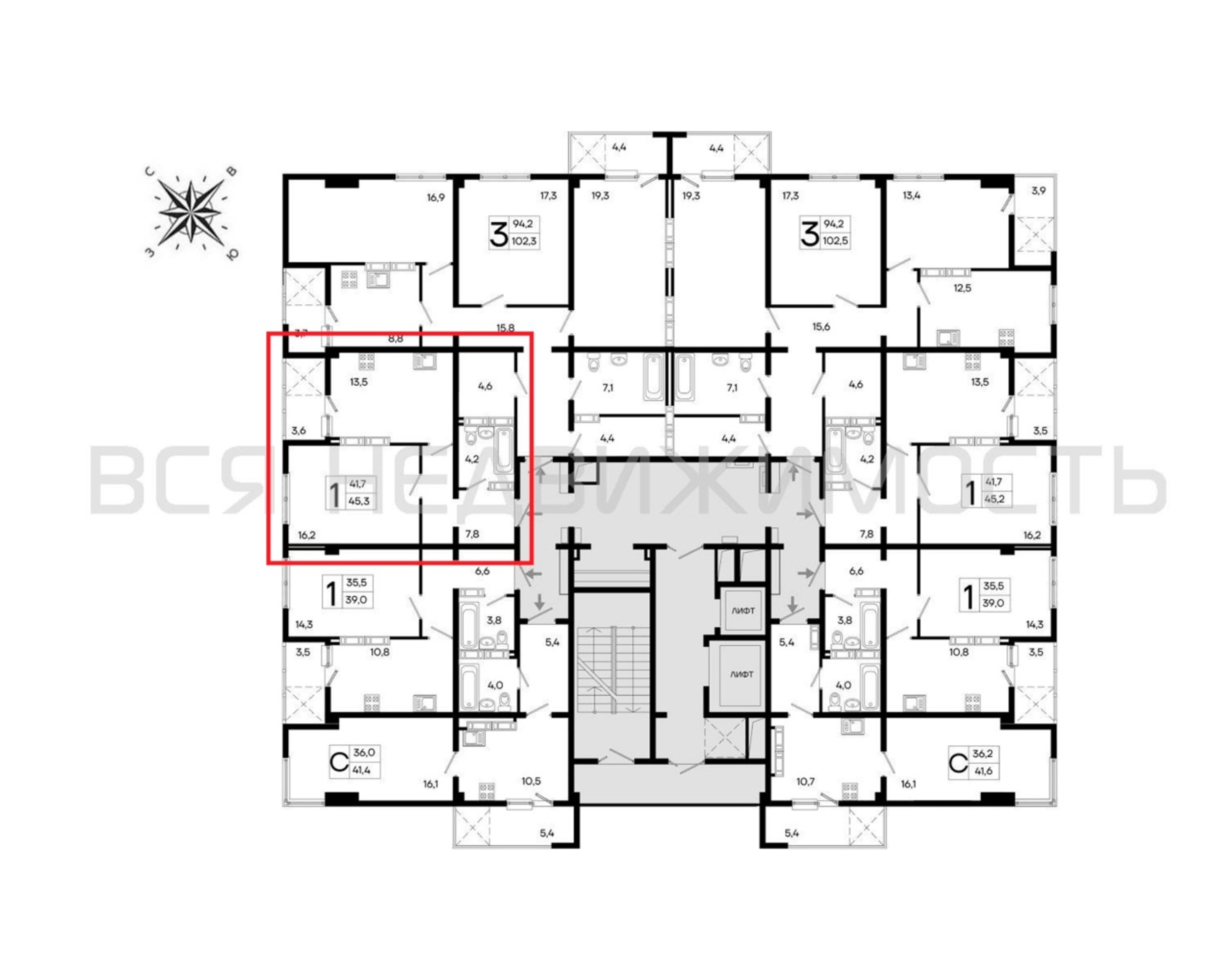 1-комнатная квартира, 45.30 м² 16/16 этаж ID объекта 100113698