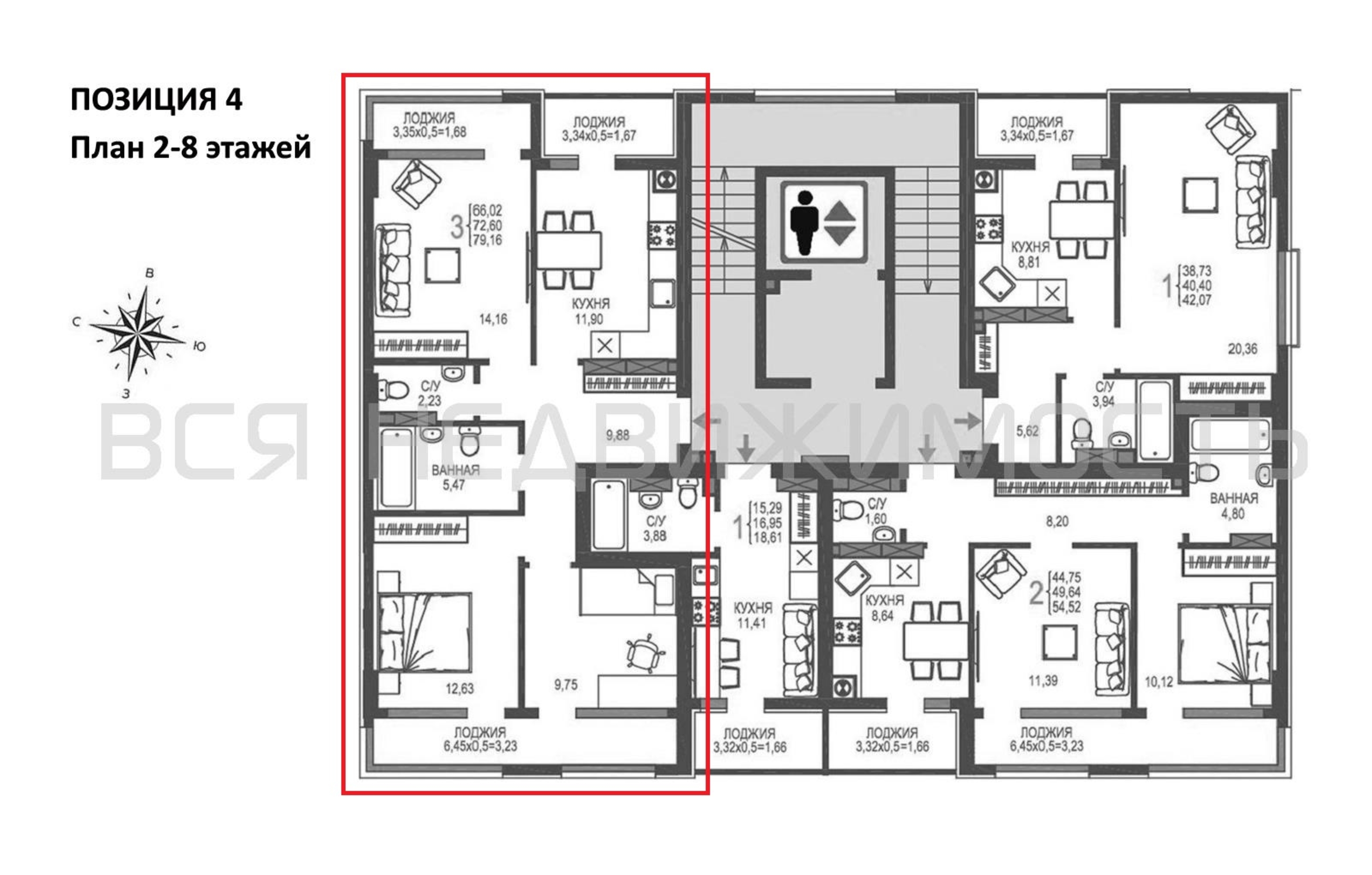 3-комнатная квартира, 72.60 м² 2/8 этаж ID объекта 100116058