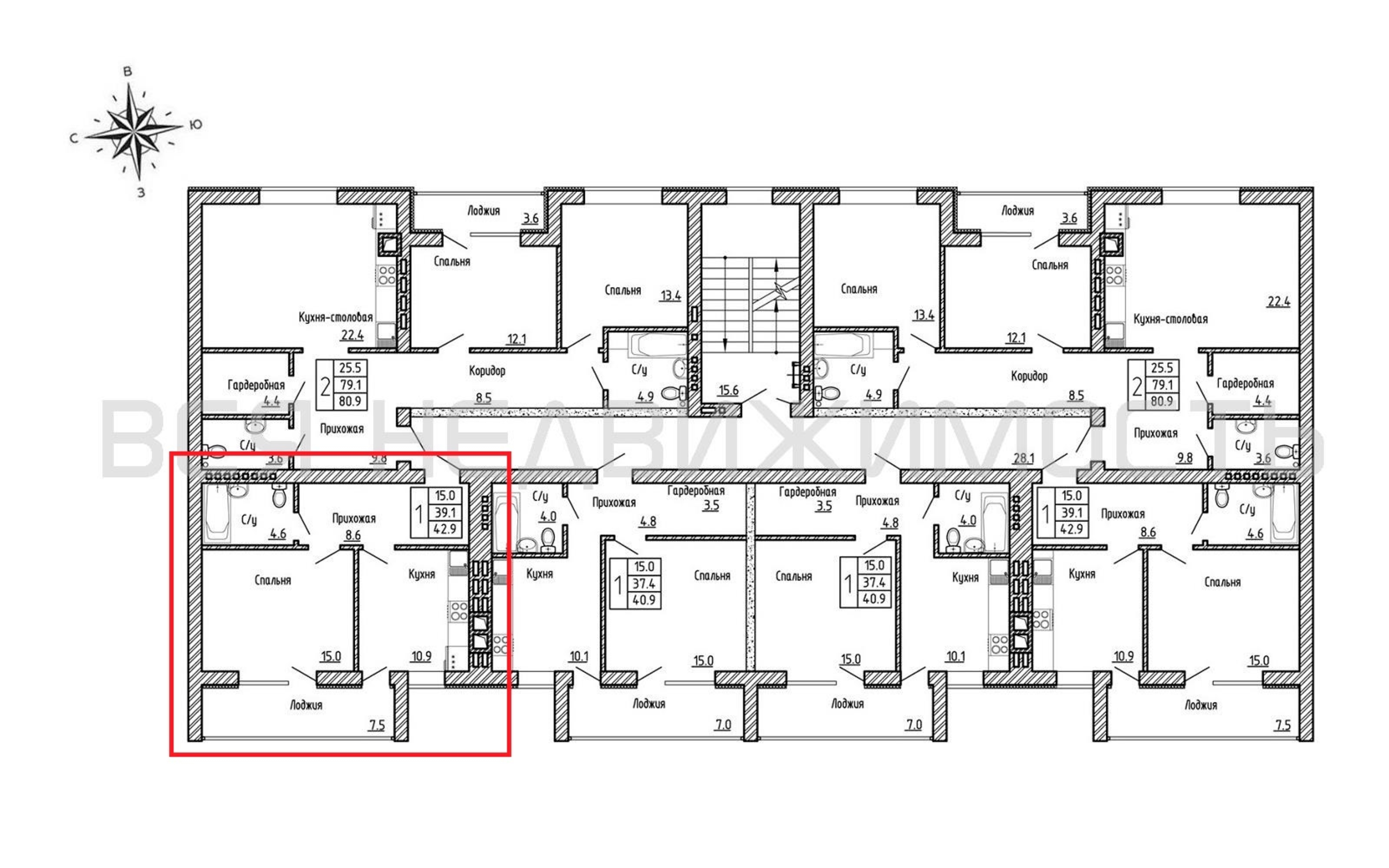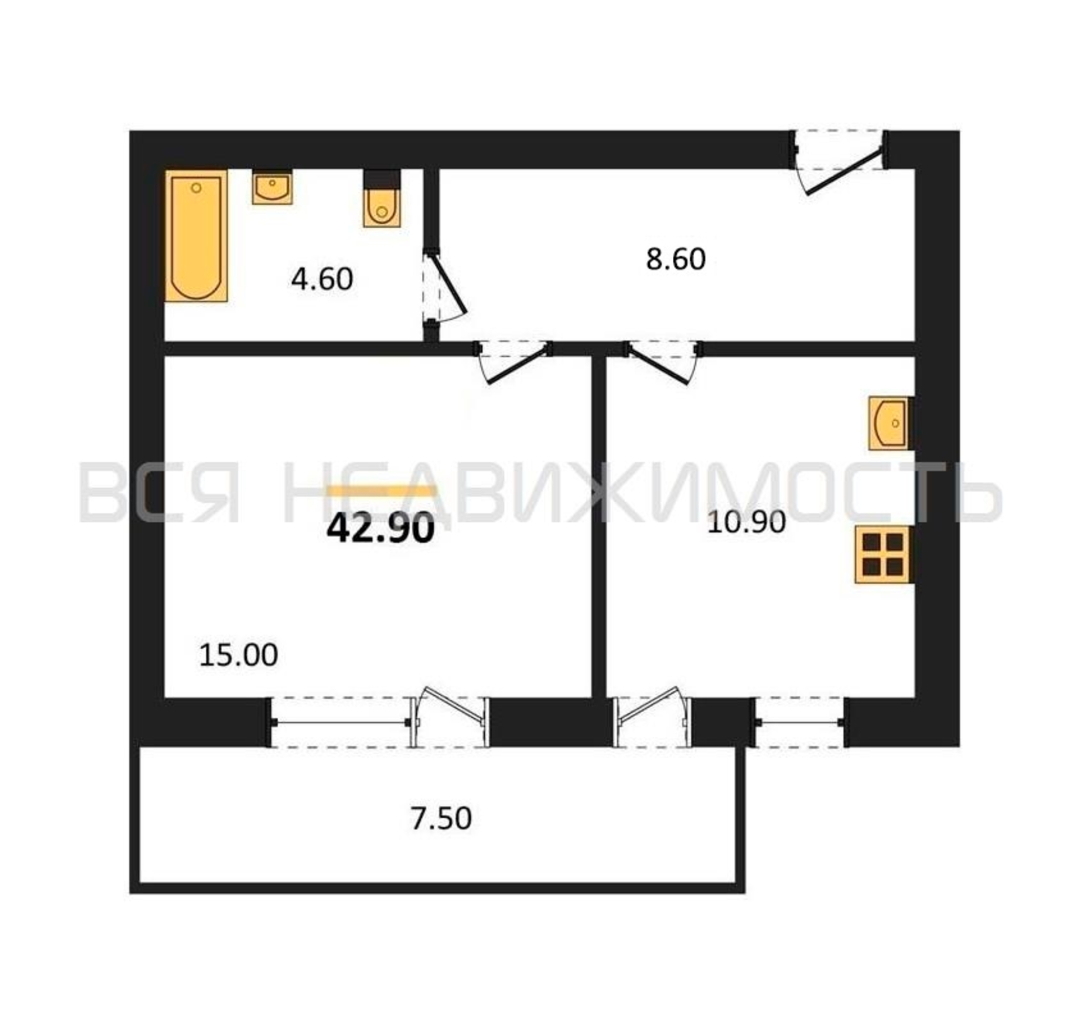 1-комнатная квартира, 42.90 м² 3/4 этаж ID объекта 100116242