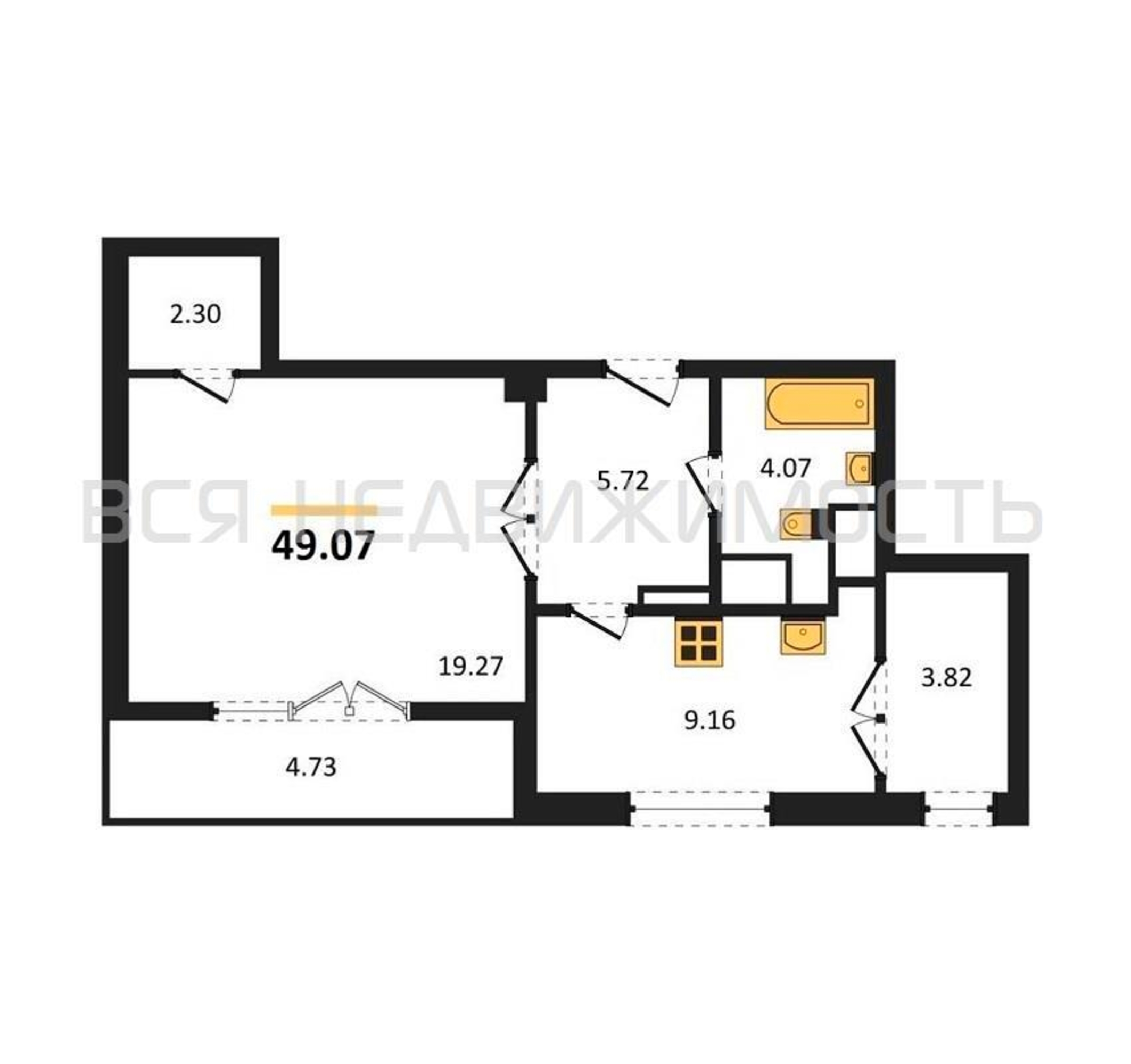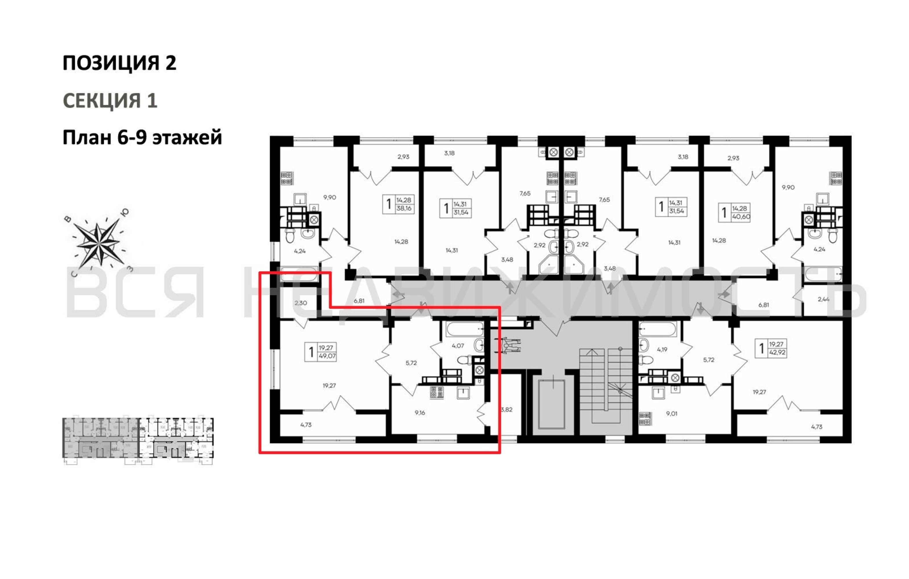 1-комнатная квартира, 49.07 м² 6/9 этаж ID объекта 100116564