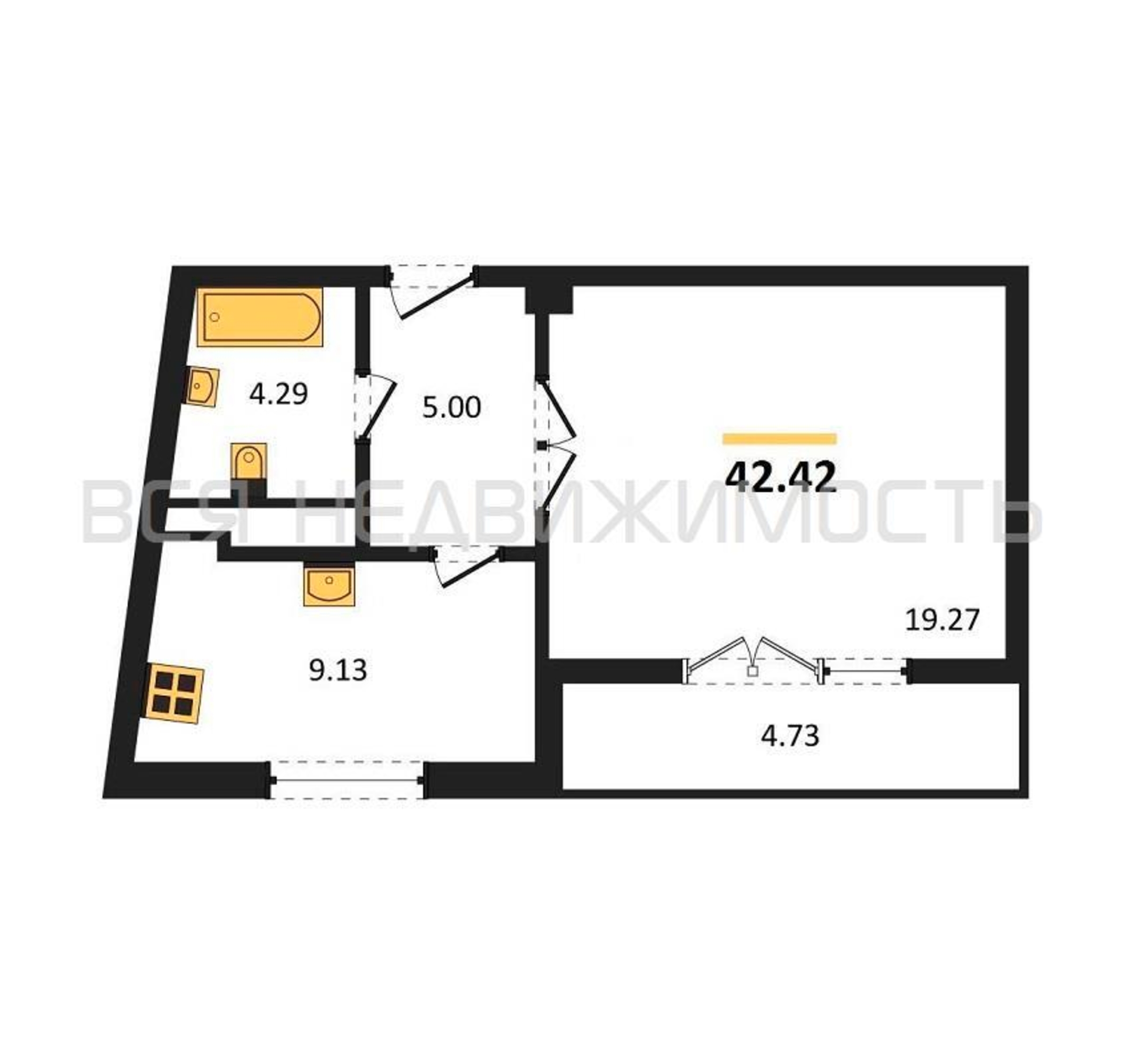 1-комнатная квартира, 42.42 м² 2/9 этаж ID объекта 100116719