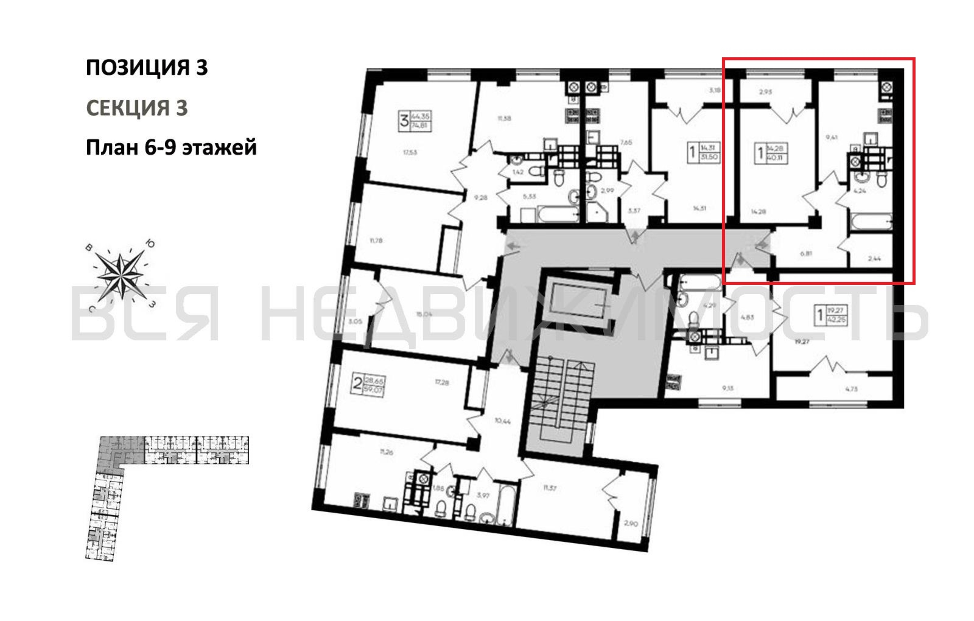 1-комнатная квартира, 40.11 м² 8/9 этаж ID объекта 100116748