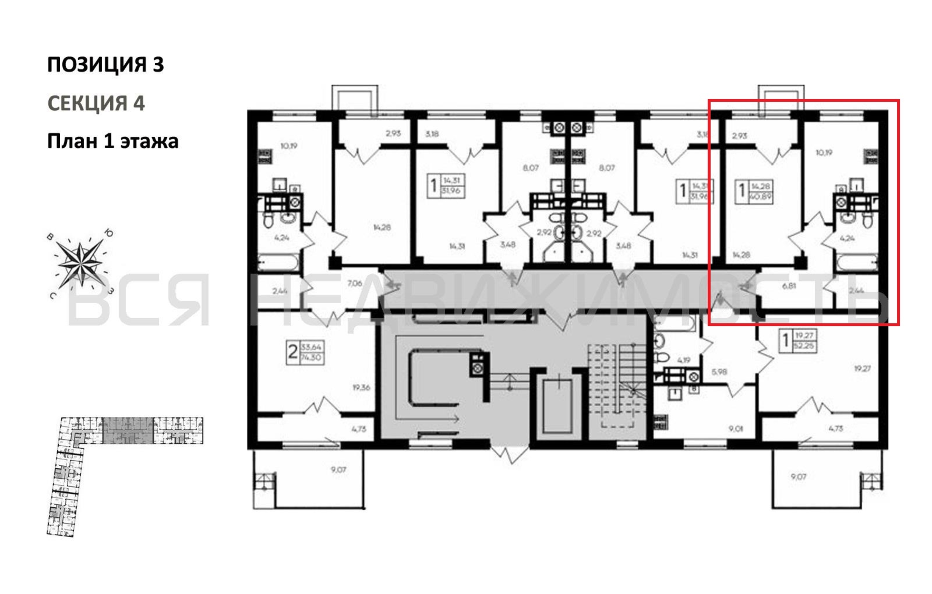 1-комнатная квартира, 40.89 м² 1/9 этаж ID объекта 100116758