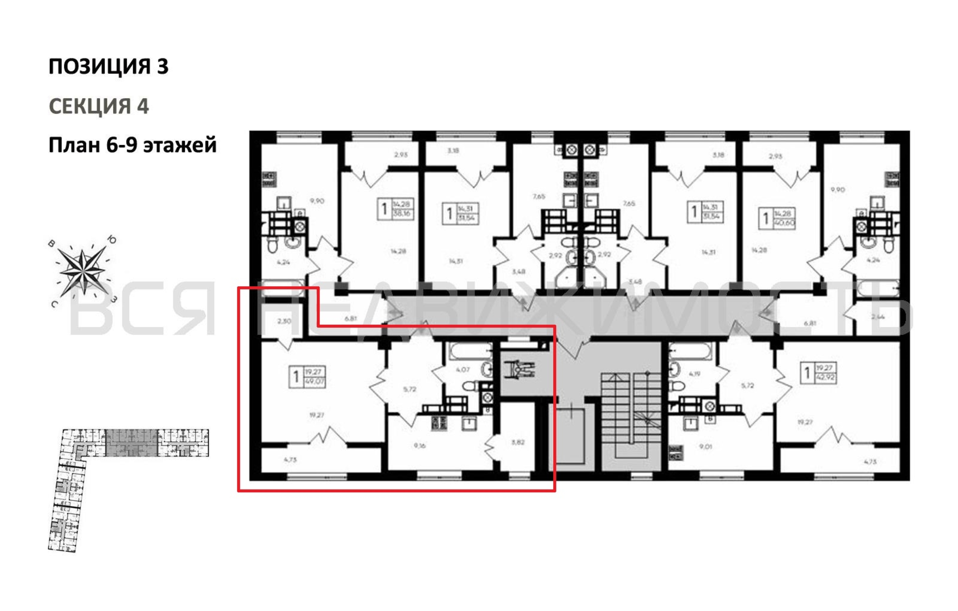 1-комнатная квартира, 49.07 м² 8/9 этаж ID объекта 100116796