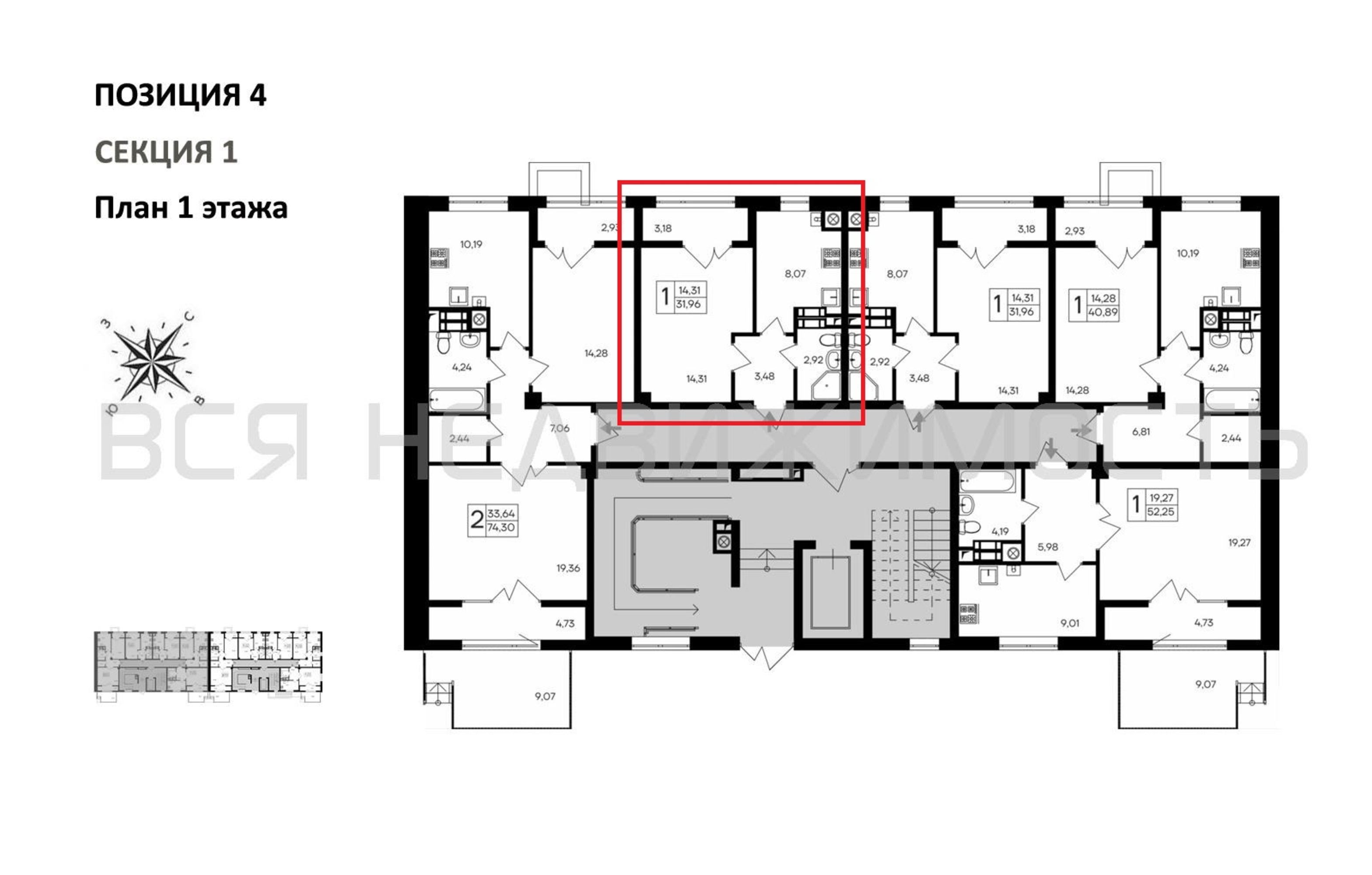 1-комнатная квартира, 31.96 м² 1/9 этаж ID объекта 100116862