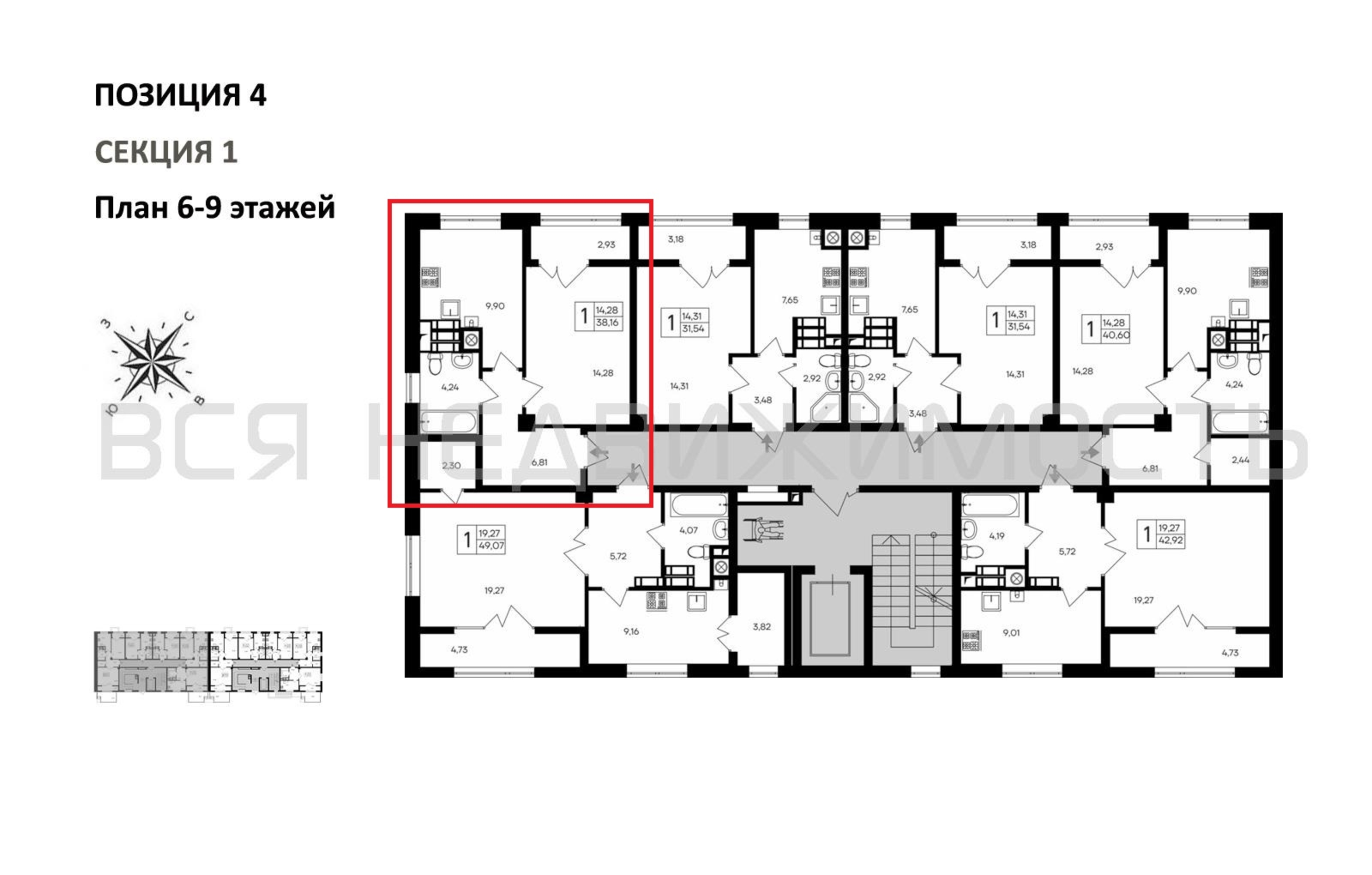 1-комнатная квартира, 38.16 м² 8/9 этаж ID объекта 100116903