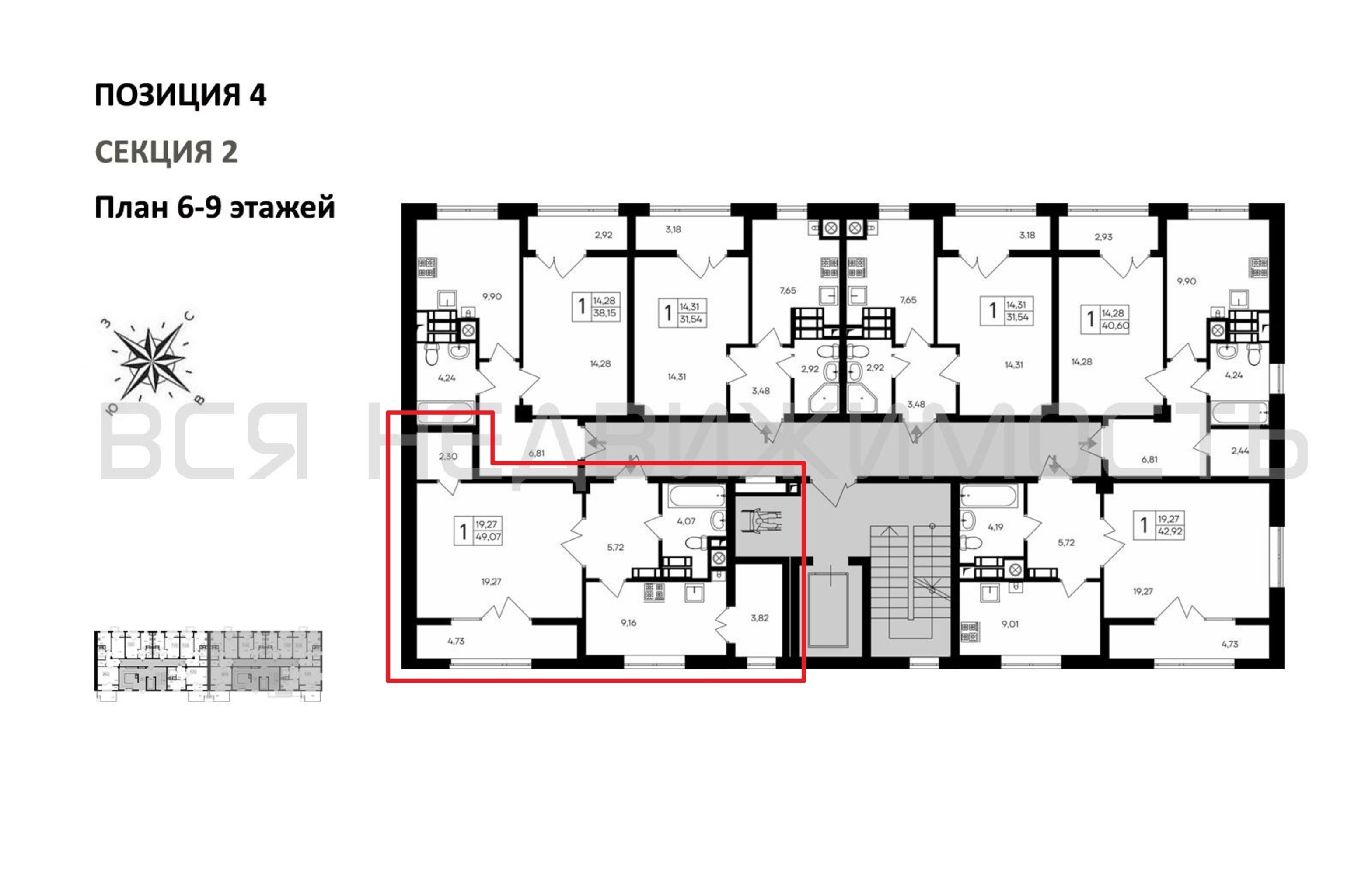 1-комнатная квартира, 49.07 м² 8/9 этаж ID объекта 100116955