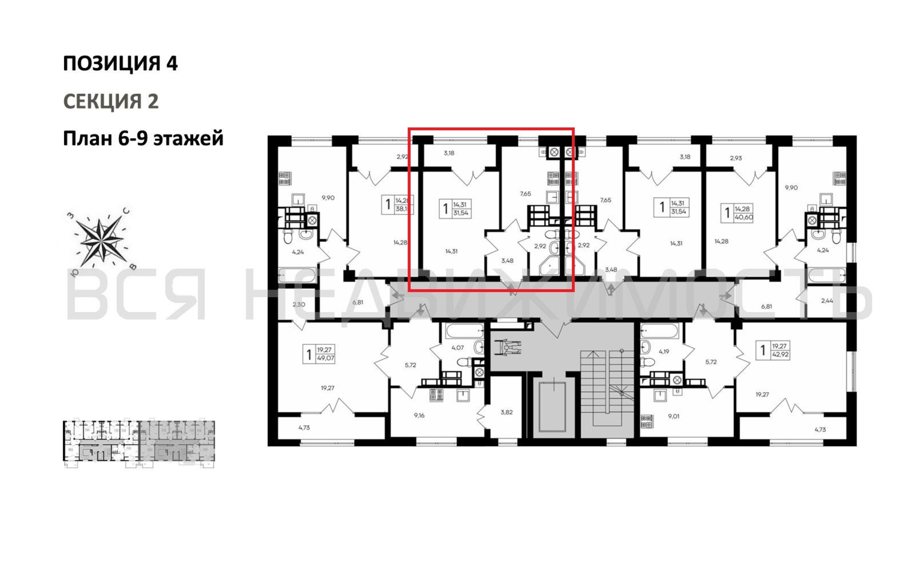 1-комнатная квартира, 31.54 м² 8/9 этаж ID объекта 100116957