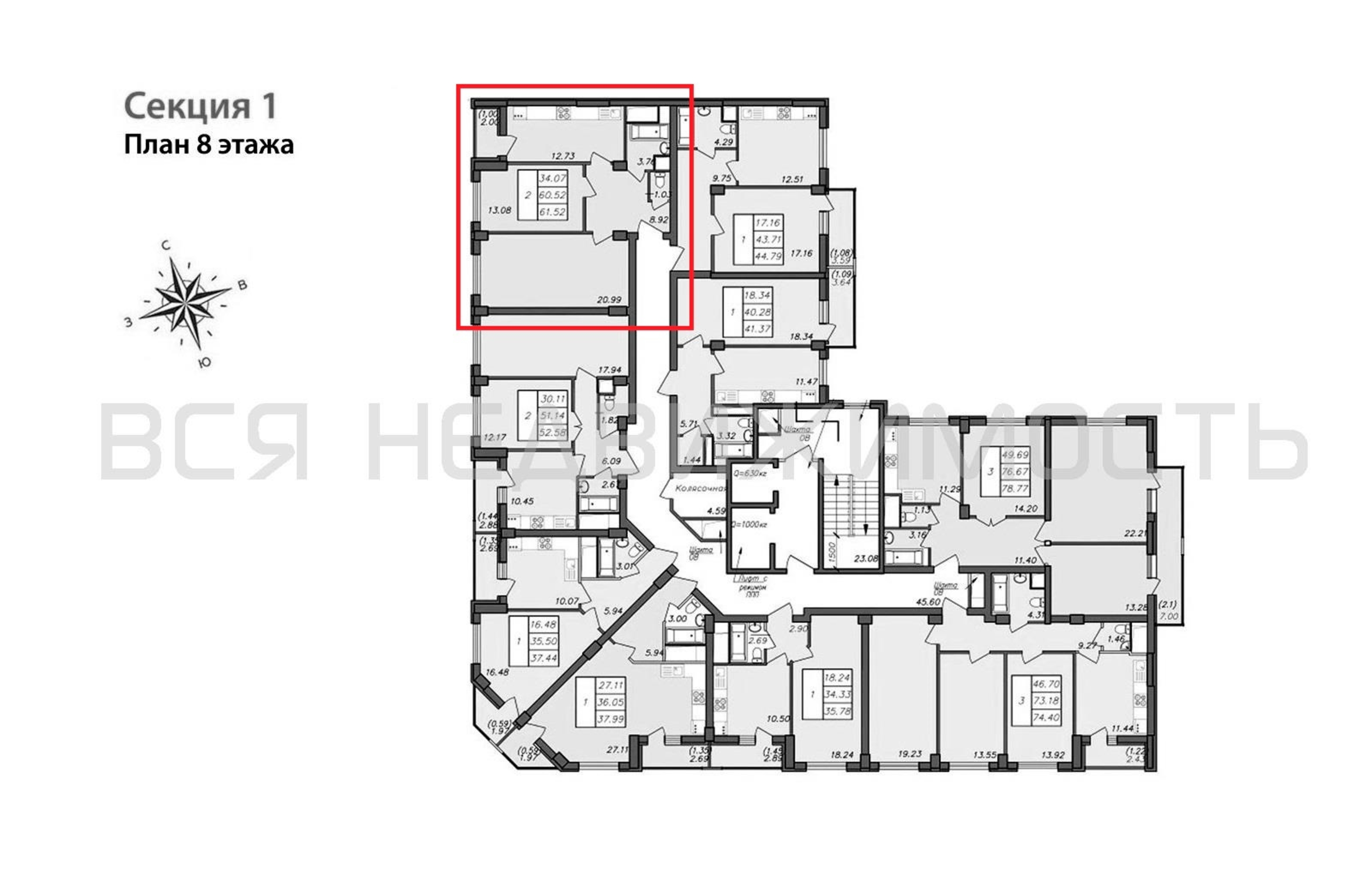2-комнатная квартира, 61.52 м² 8/13 этаж ID объекта 100118015