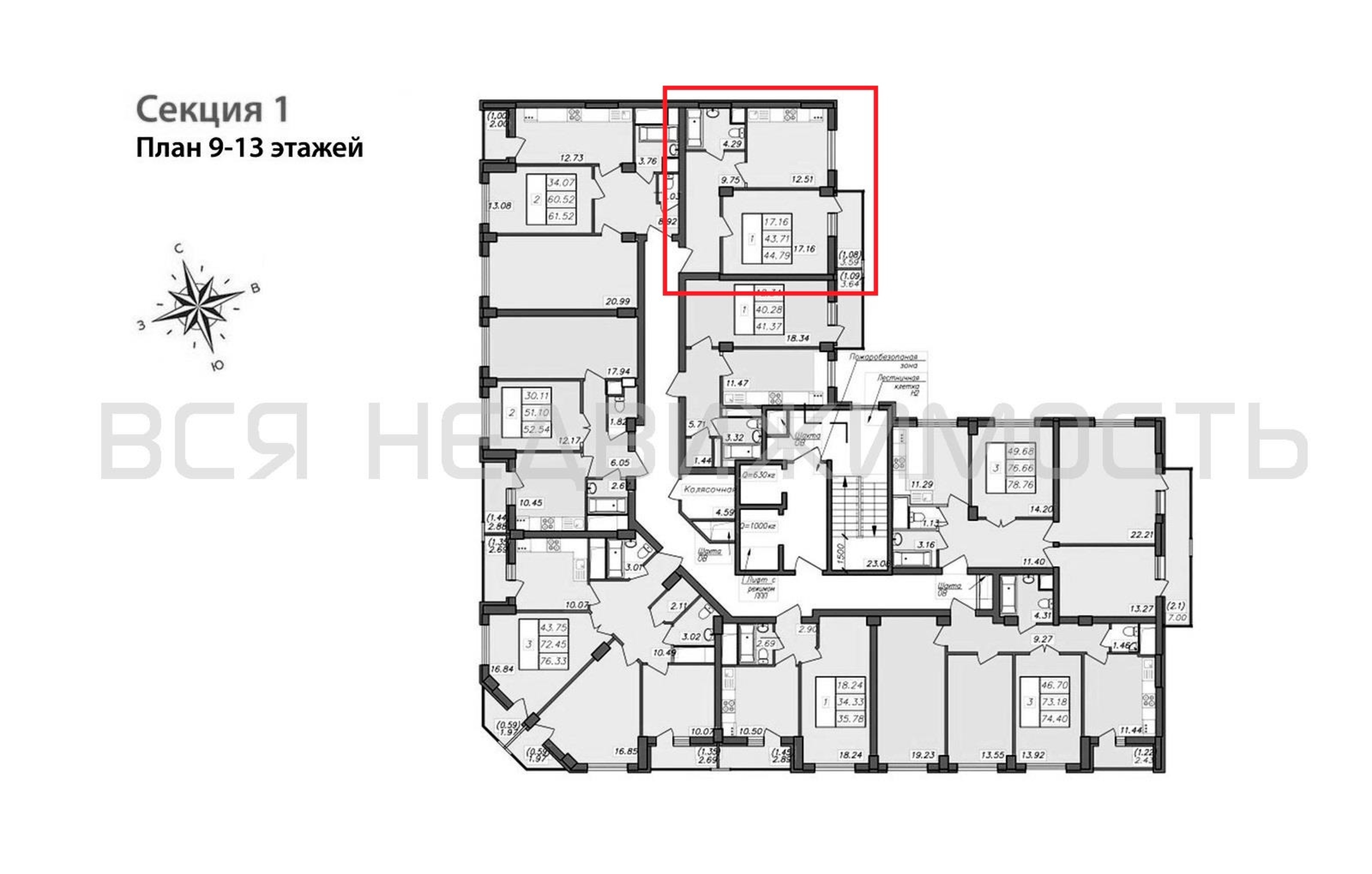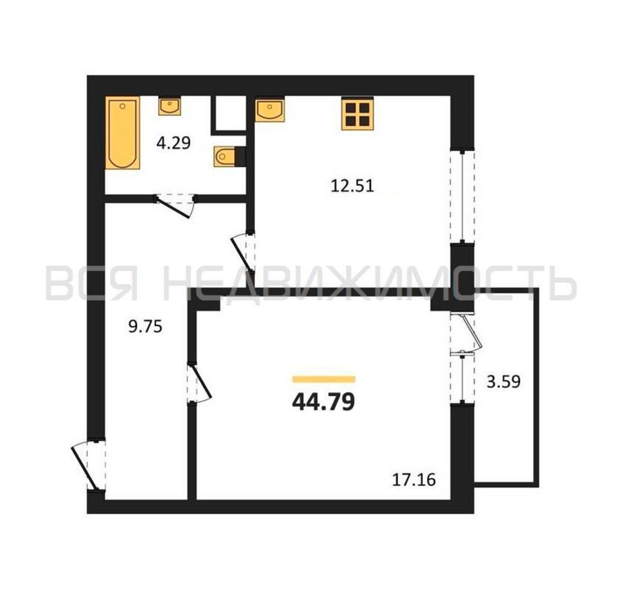 1-комнатная квартира, 44.79 м² 12/13 этаж ID объекта 100118048
