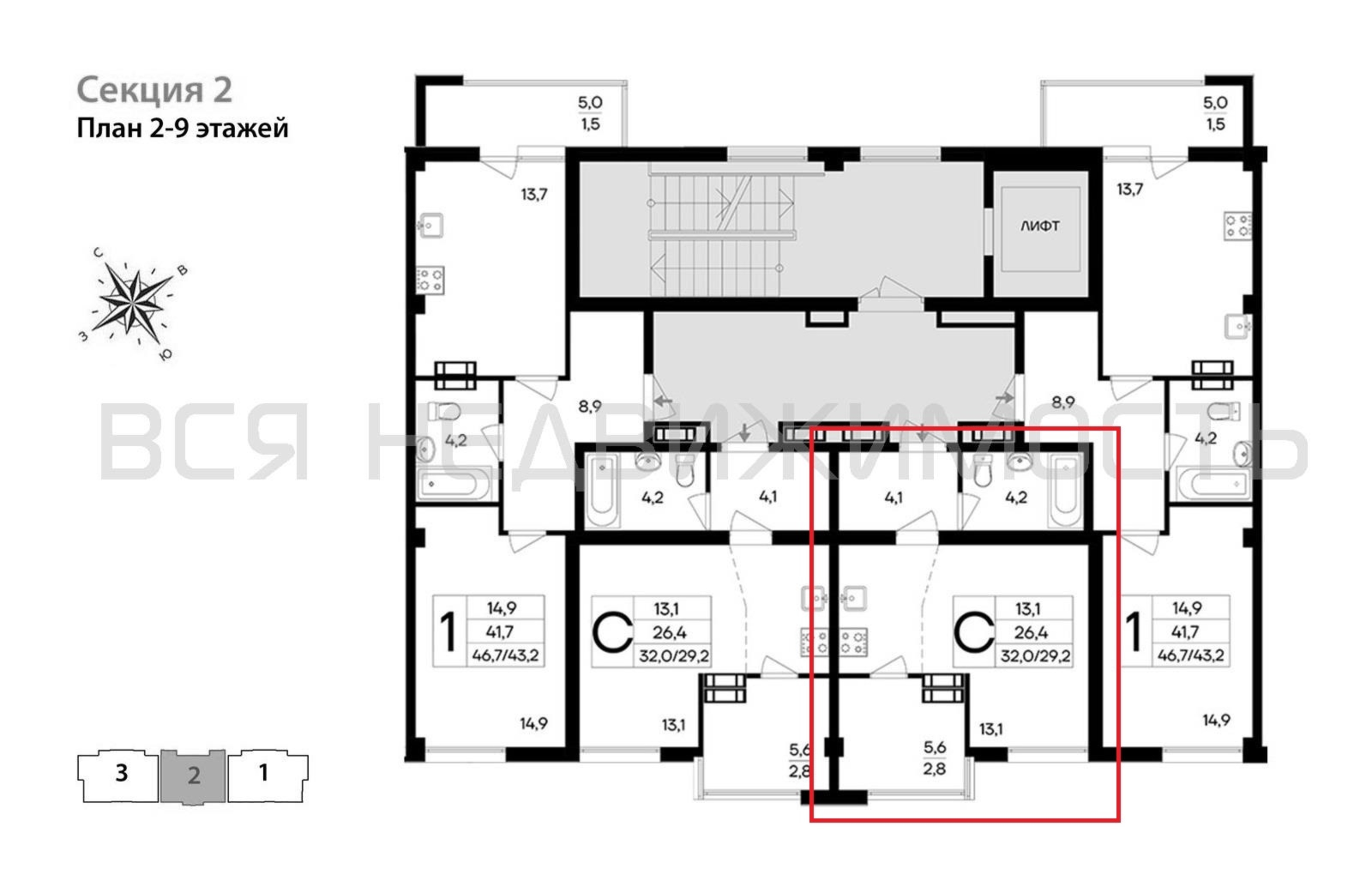 Квартиры-студии, 32.00 м² 6/9 этаж ID объекта 100121655