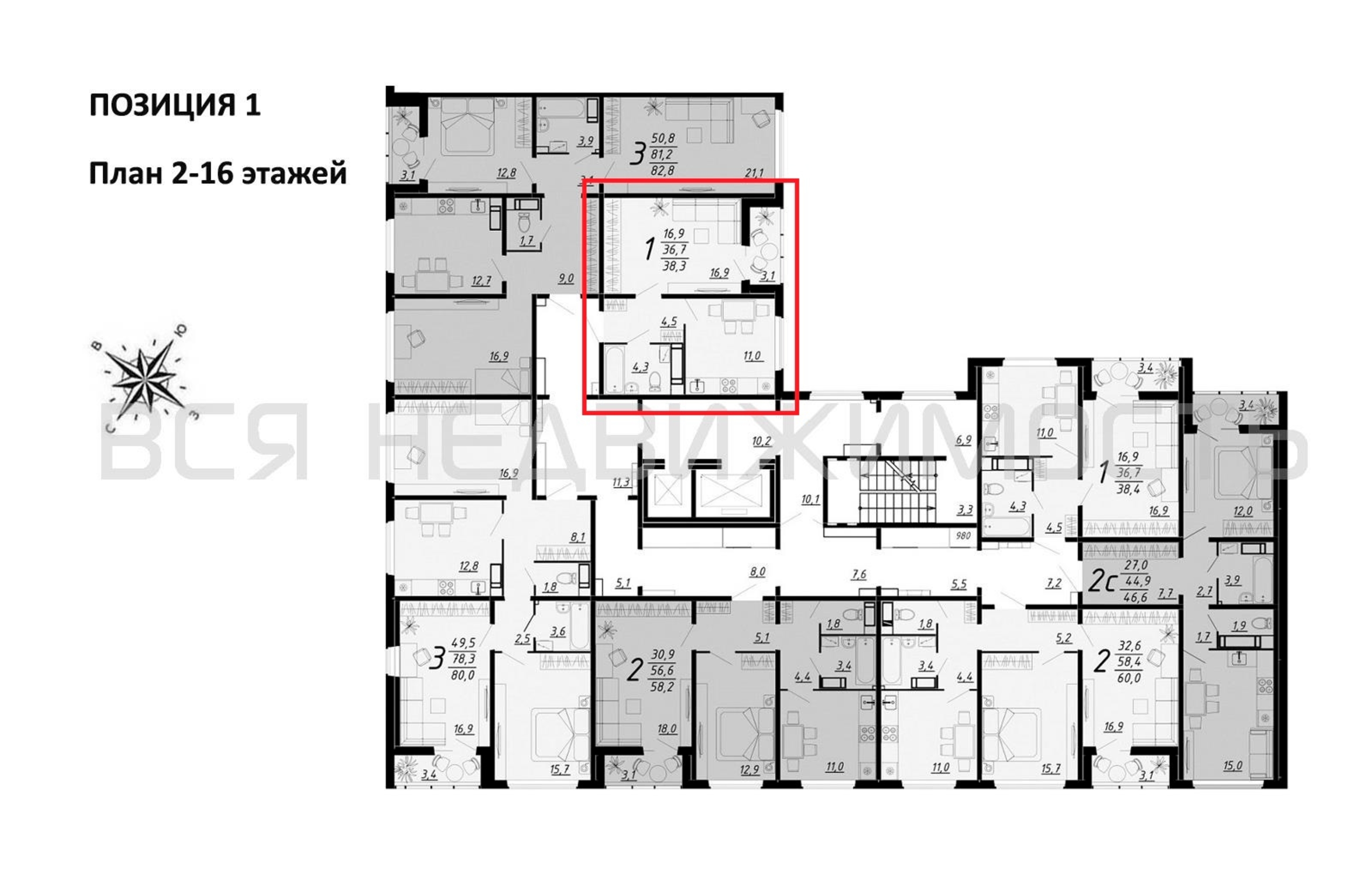1-комнатная квартира, 38.30 м² 10/16 этаж ID объекта 100124414