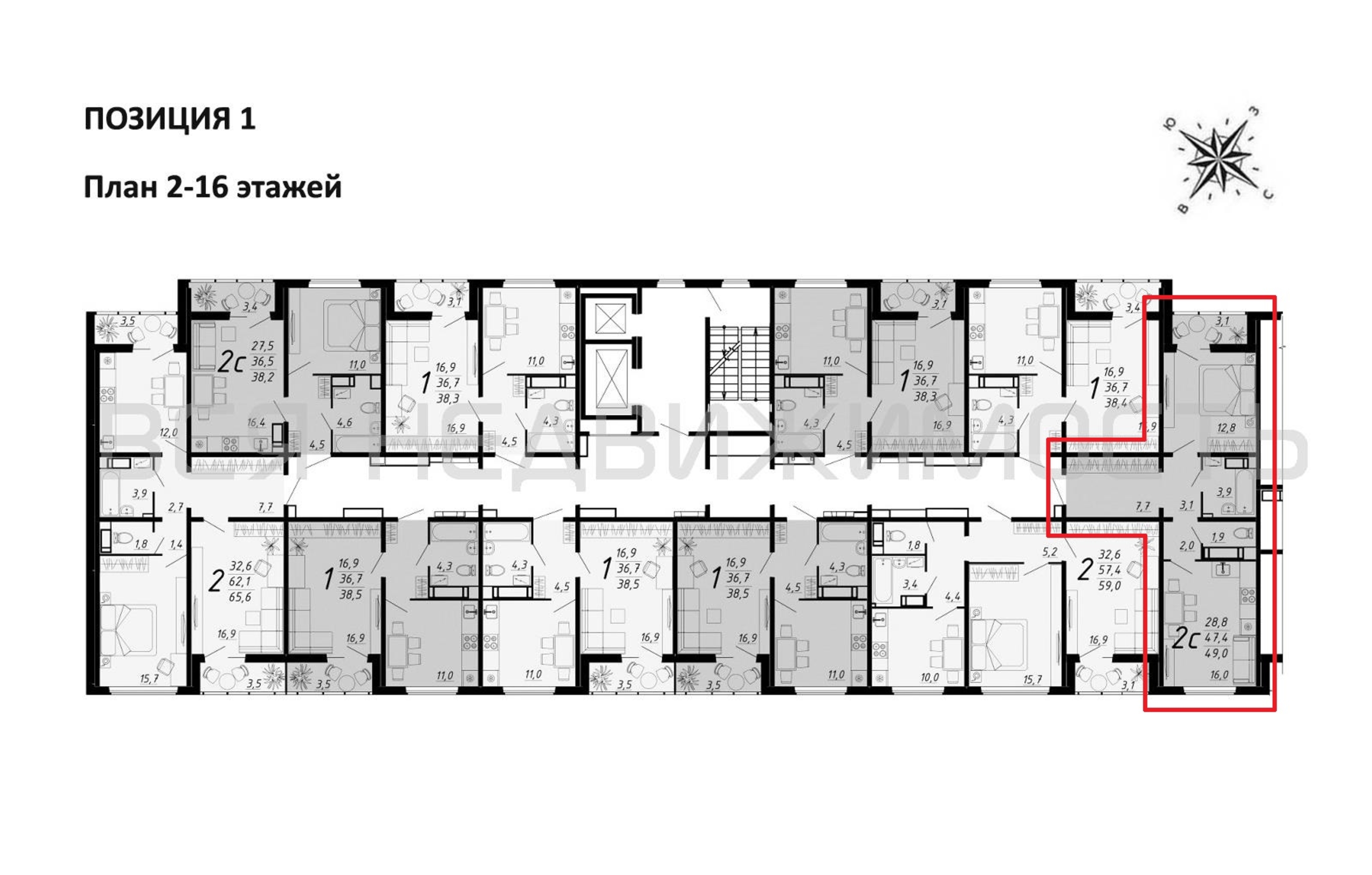 1-комнатная квартира, 49.00 м² 16/16 этаж ID объекта 100124599