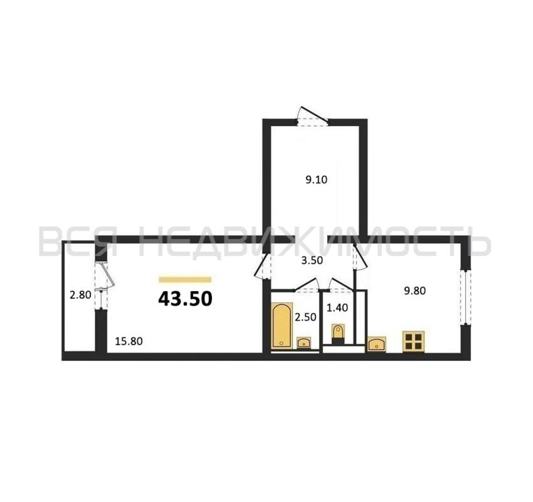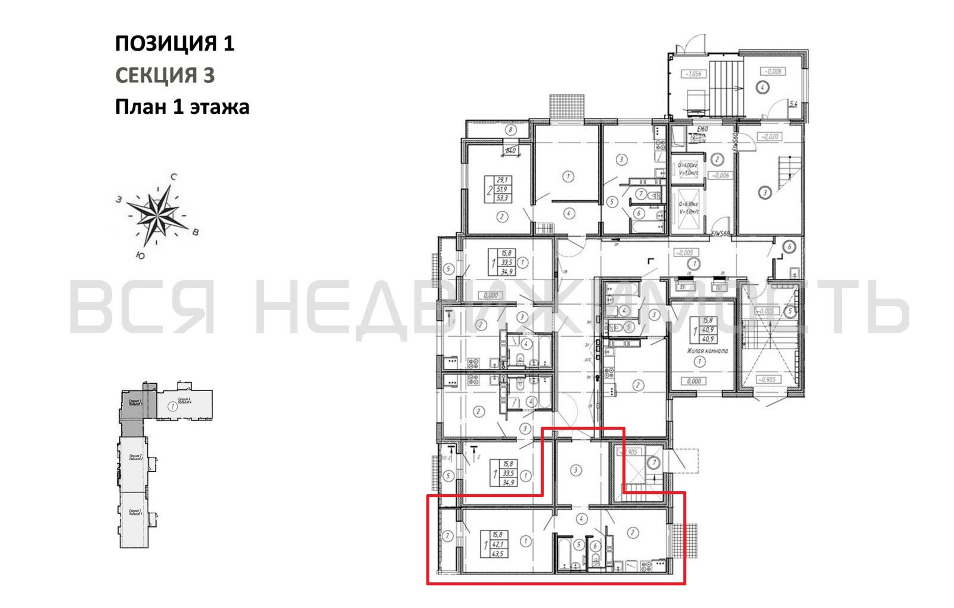 1-комнатная квартира, 43.50 м² 1/17 этаж ID объекта 100125008