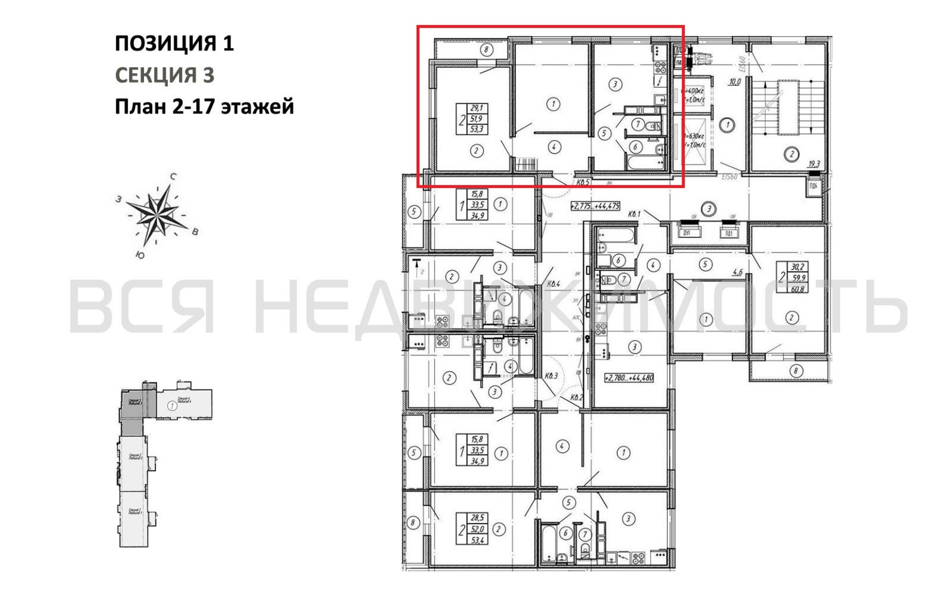 2-комнатная квартира, 53.30 м² 7/17 этаж ID объекта 100125041